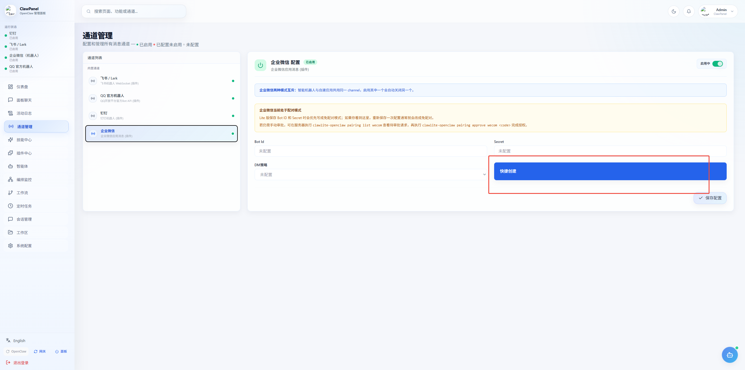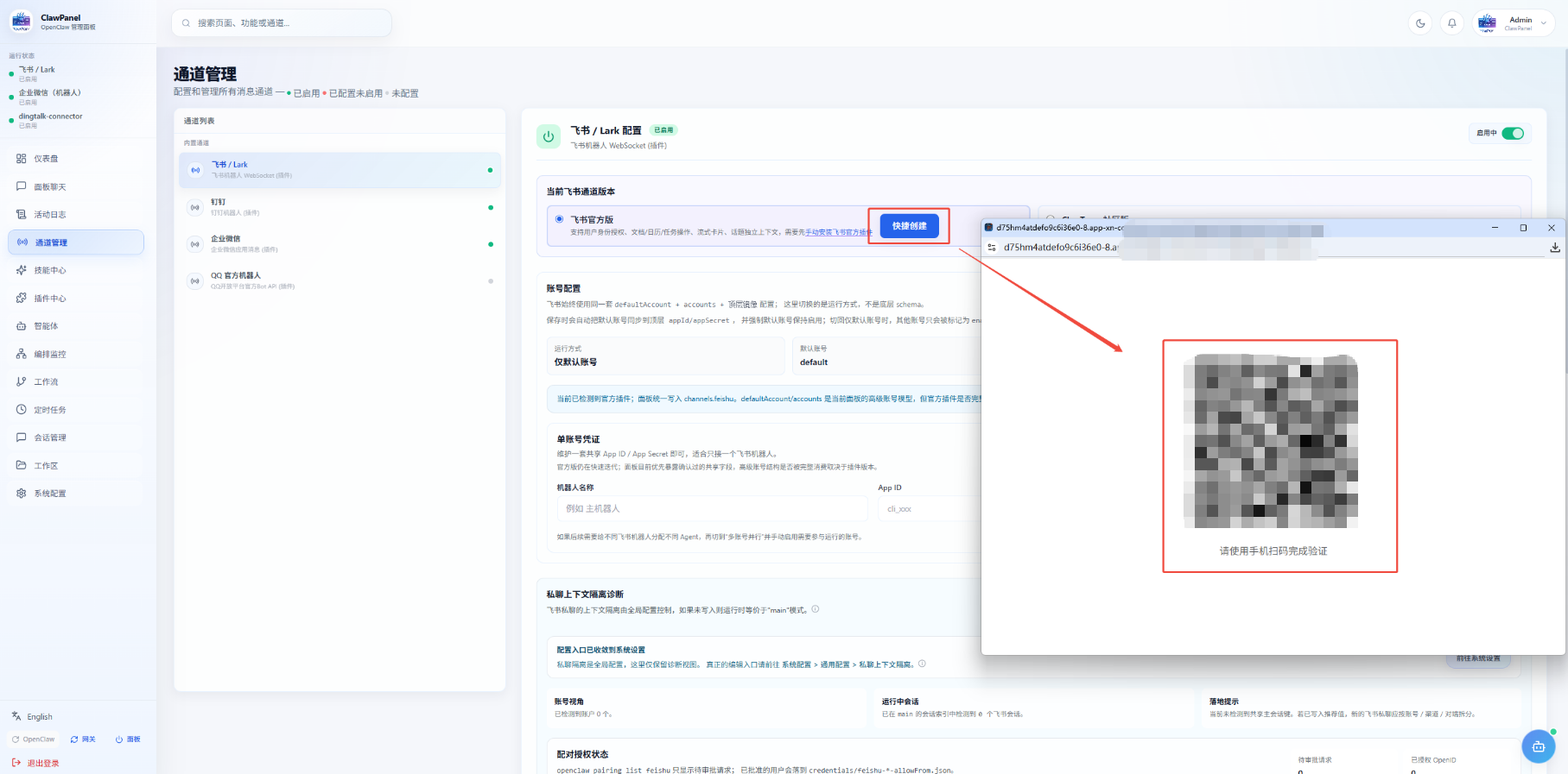 1. 点击【通道管理】,在通道列表点击飞书/Lark,点击按钮【快捷创建】,即可通过扫描方式快速接入。