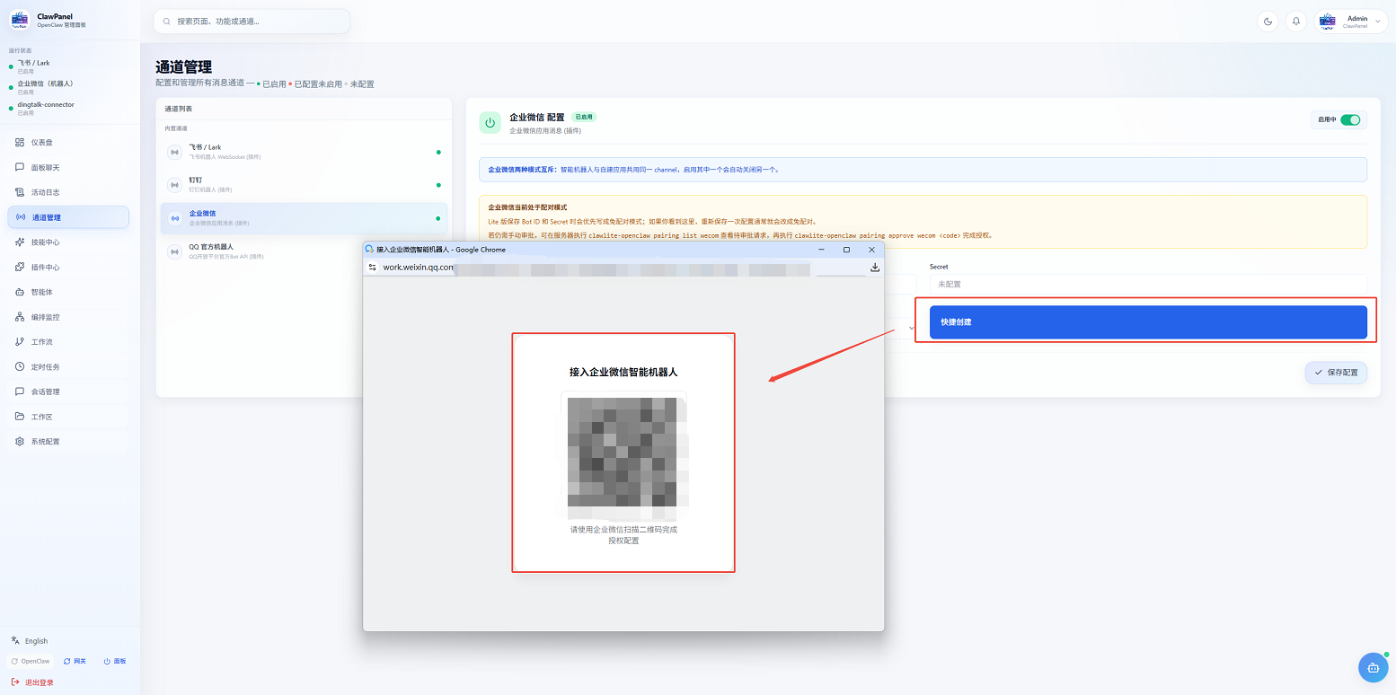 1.点击【通道管理】,在通道列表点击企业微信,点击按钮【快捷创建】,即可通过扫描方式快速接入。