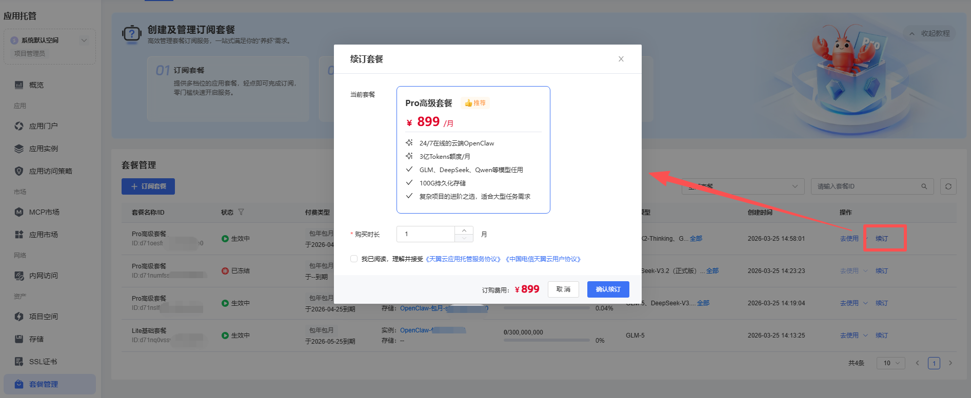进入【套餐管理】页面,在套餐列表中找到目标套餐。点击【续订】按钮,出现续订套餐弹窗。