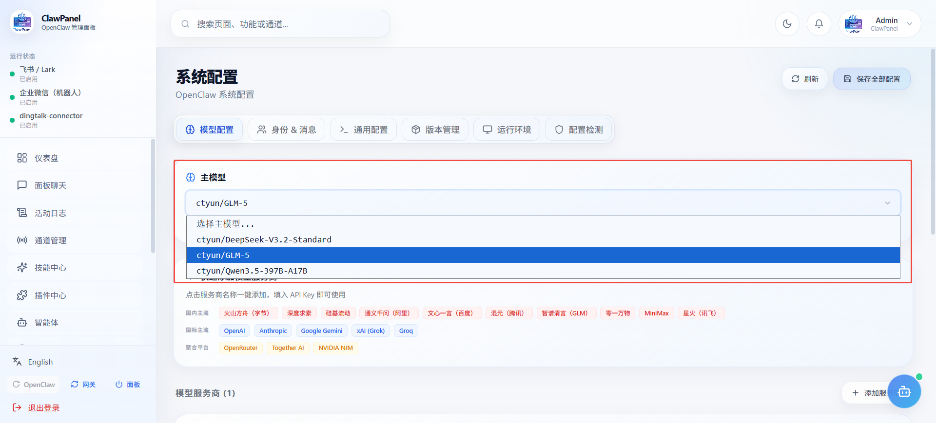 如订购Pro高级套餐,默认主模型为“GLM-5”。可通智能管理面板,修改模型。