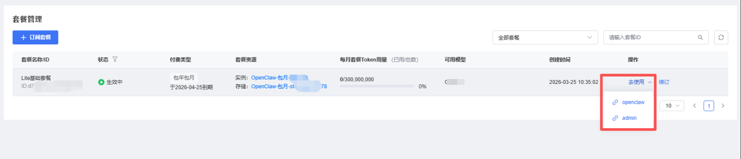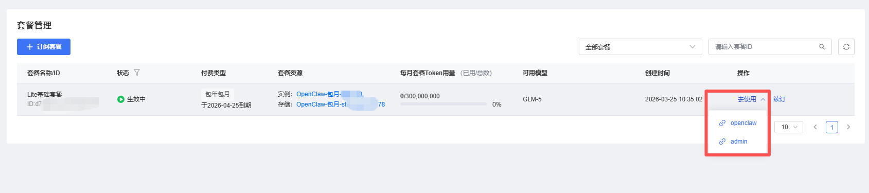 订单支付完成后回到应用托管控制台,进入【套餐管理】页面,可查询到已订购的套餐,状态为「生效中」,系统自动创建 OpenClaw 实例,资源准备预计 1-5 分钟,请耐心等待。