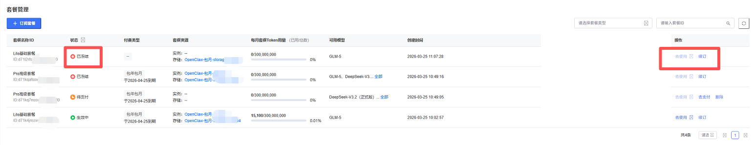 已冻结的 Lite/Pro 套餐完成续订后,系统自动执行恢复,套餐包含的资源可正常使用。