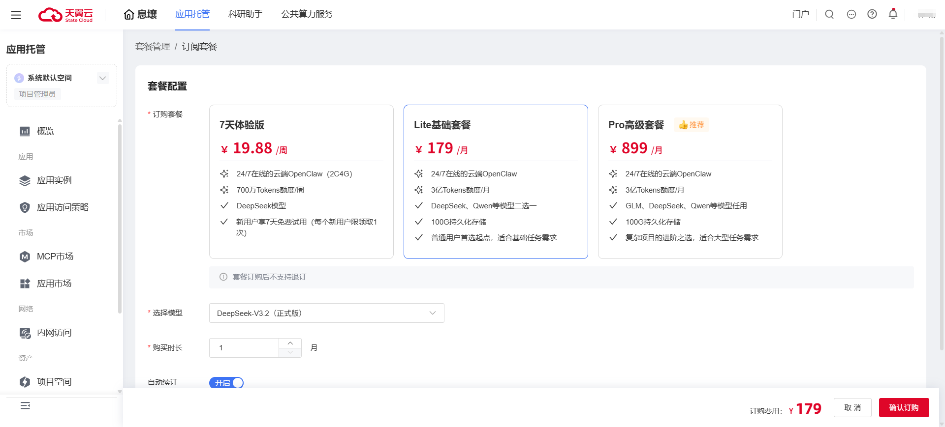 | Lite 基础套餐 | √ 资源配置:24/7在线的云端OpenClaw(2C4G) √ Token额度:3亿Tokens额度/月 √ 支持模型:DeepSeek、Qwen等模型二选一 √ 100G 持久化存储 √ 适用场景:普通用户首选起点,适合基础任务需求 | 时长:默认 1 个月,可选 1-12 个月 数量:1 个 | 默认自动续订,可关闭 | 1. 不支持退订 2. 一个套餐对应 1 个 OpenClaw 实例 |