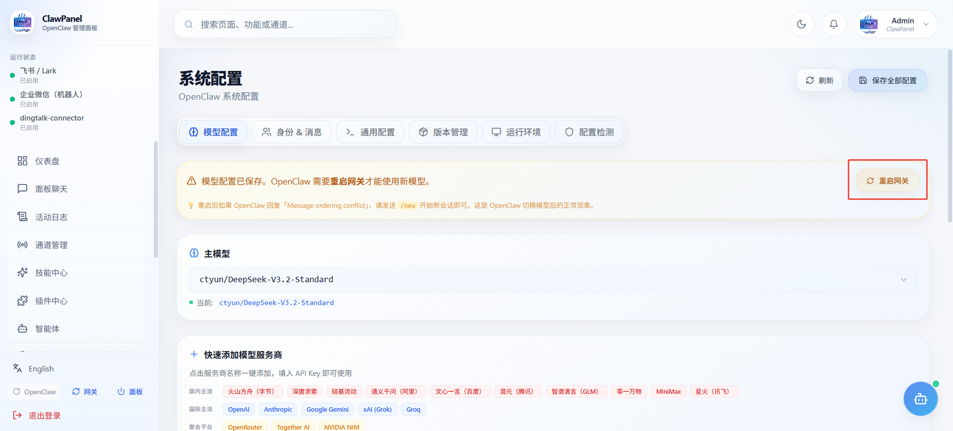 2. 点击左侧【系统配置】菜单,进入系统配置页面,在「主模型」配置中可以切换套餐中支持的模型(Pro高级套餐模型已全部内置,无需手动添加),修改后点击“保持全部配置”。