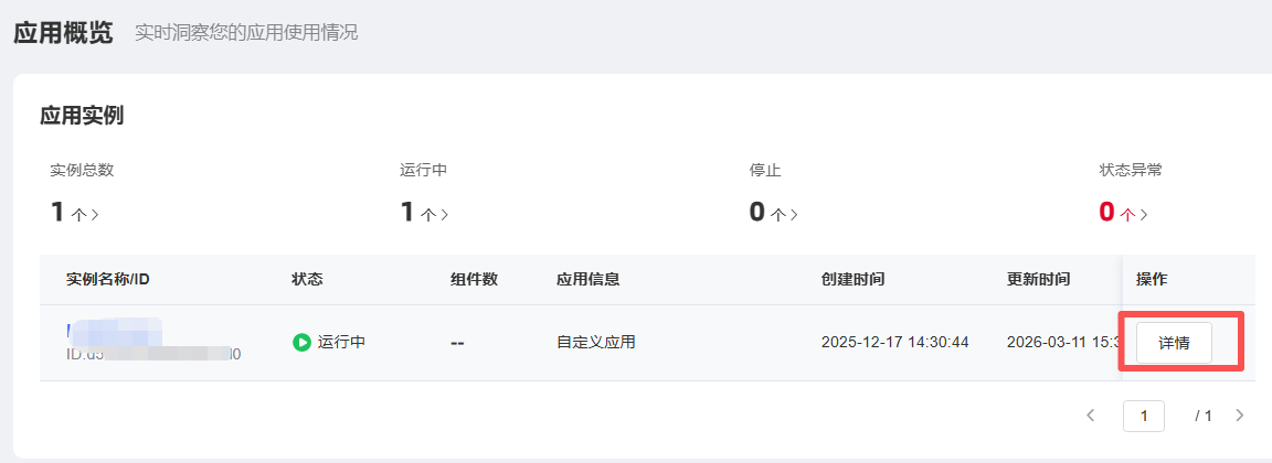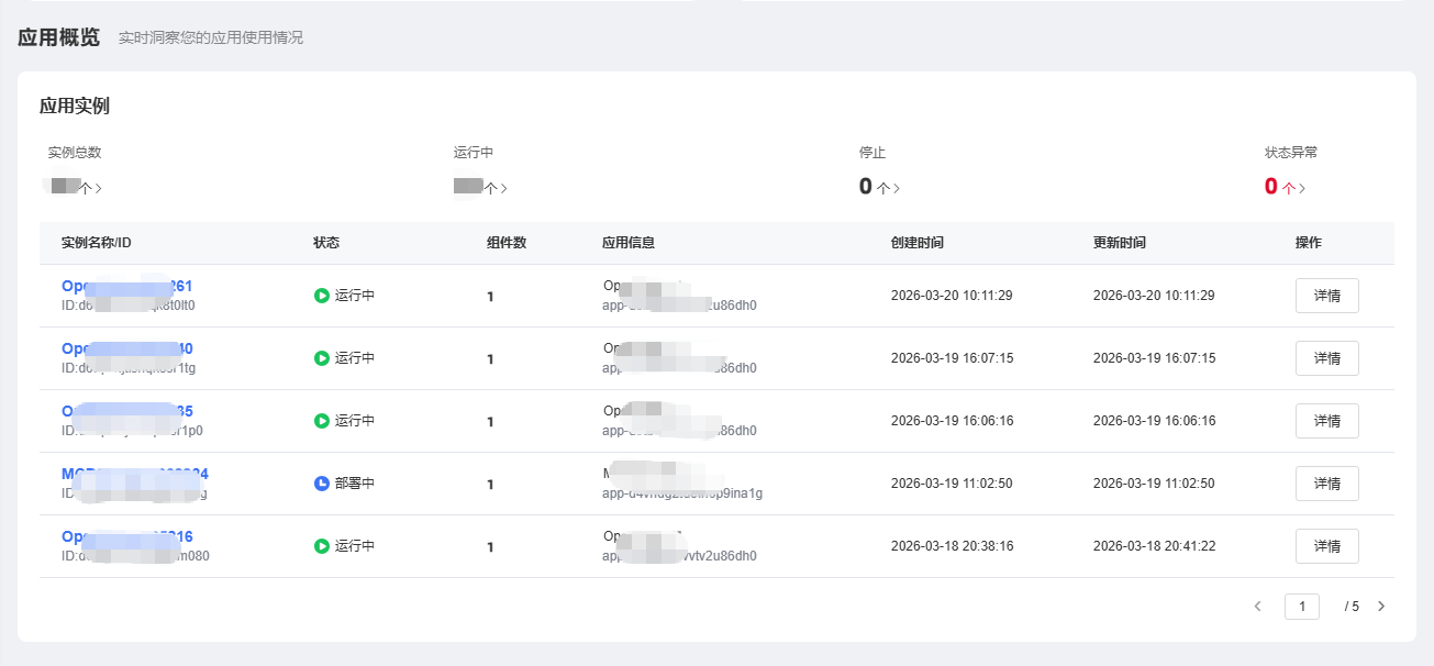 实例列表:展示实例名称 / ID、状态、组件数、应用信息、创建时间、更新时间、及操作,支持分页浏览。