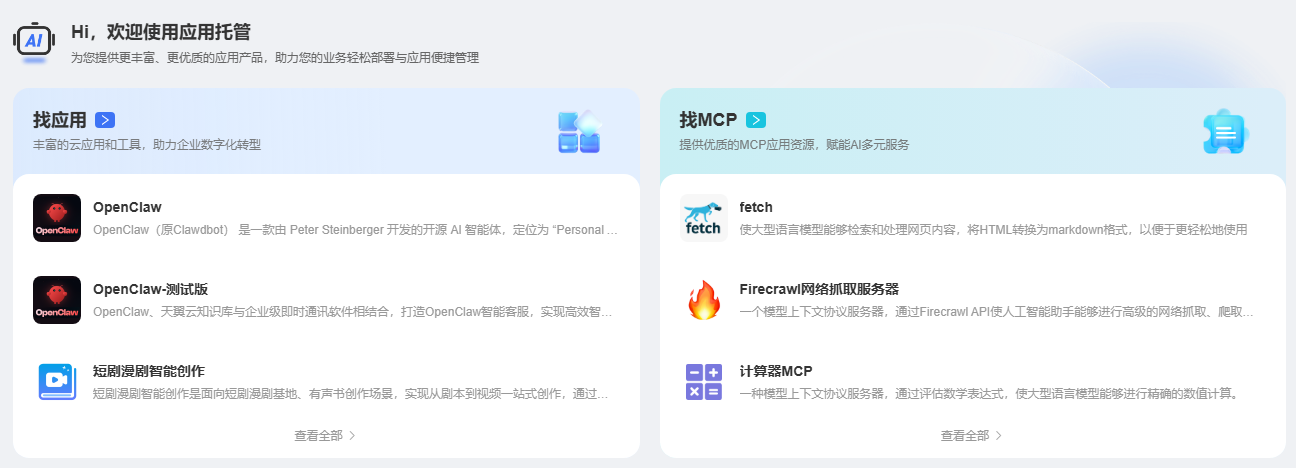产品介绍:查看应用托管与 OpenClaw 产品能力说明。