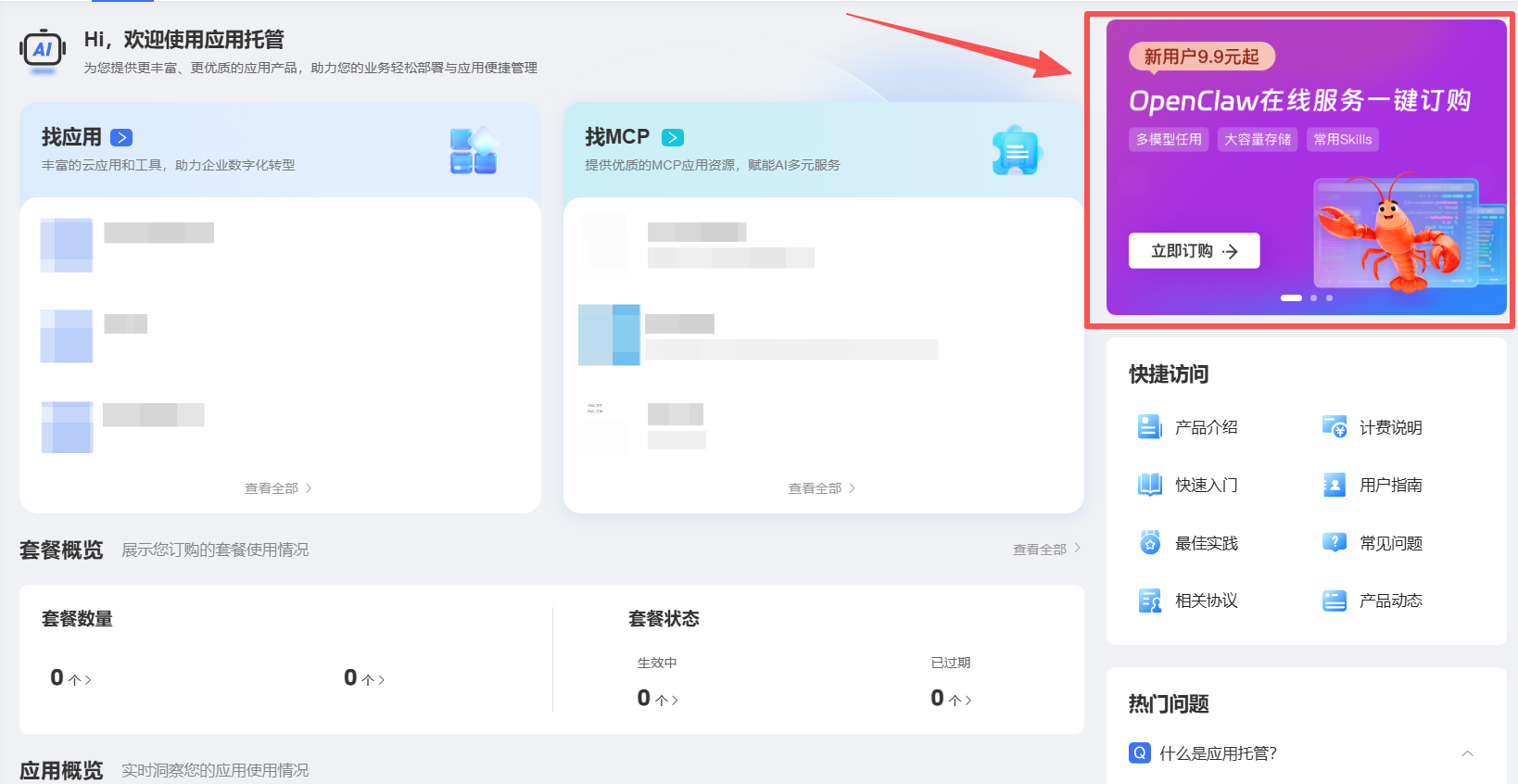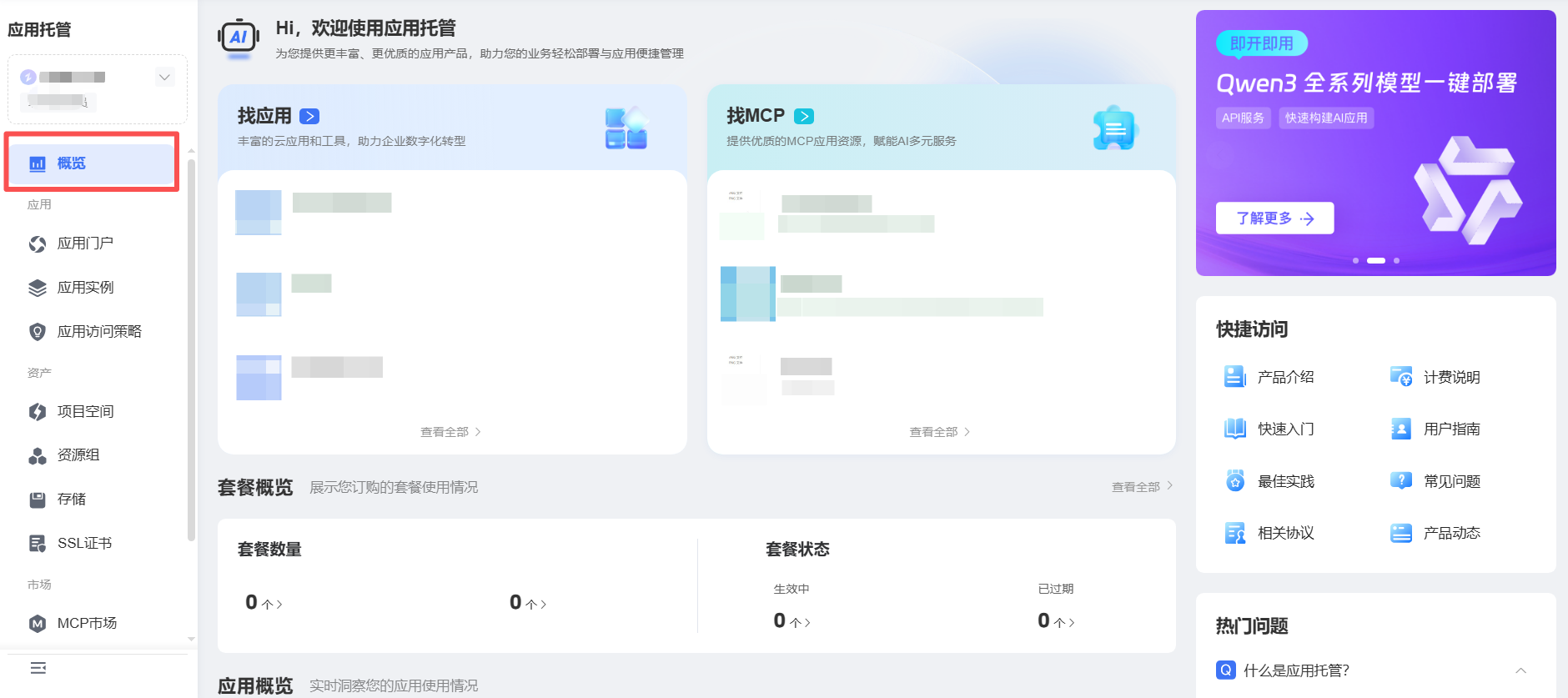 本文档为您介绍天翼云应用托管概览页的功能与操作步骤,帮助您快速完成套餐订购、产品使用概况查询与快捷功能访问等内容。