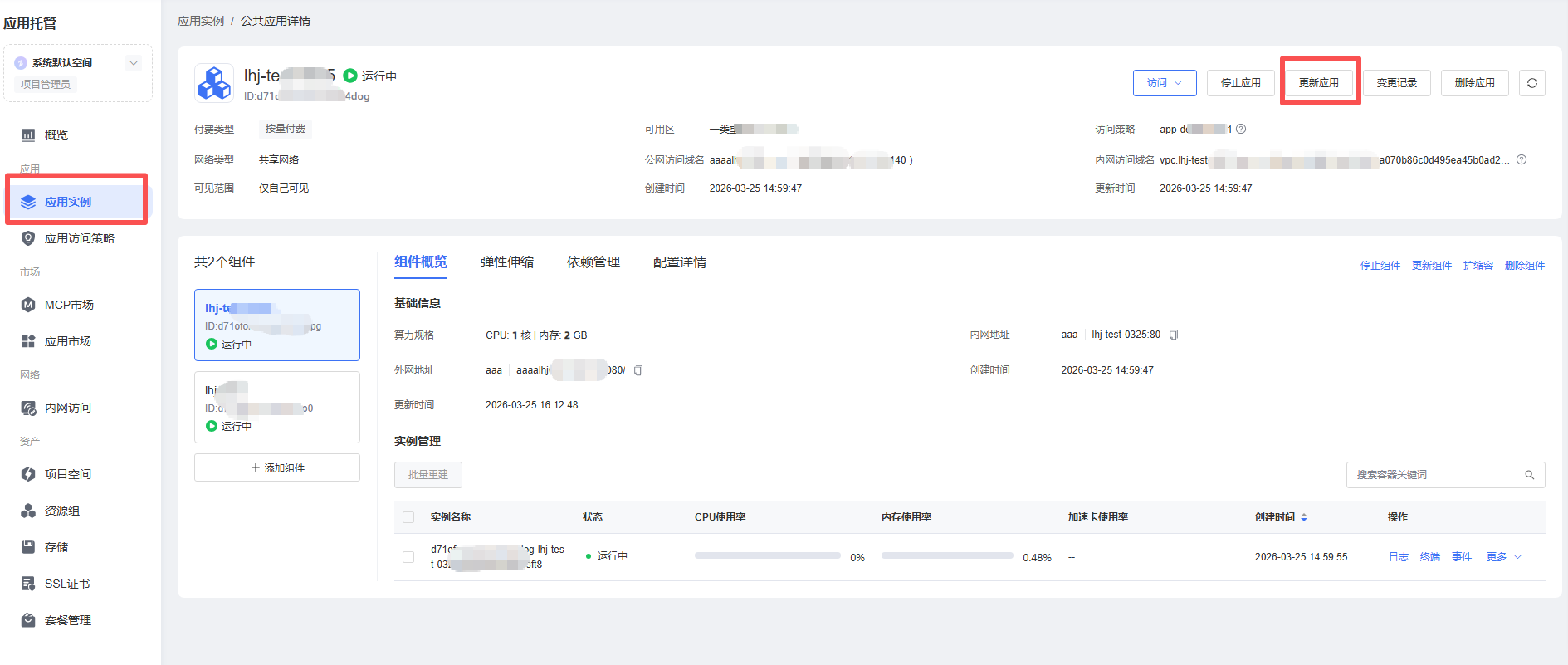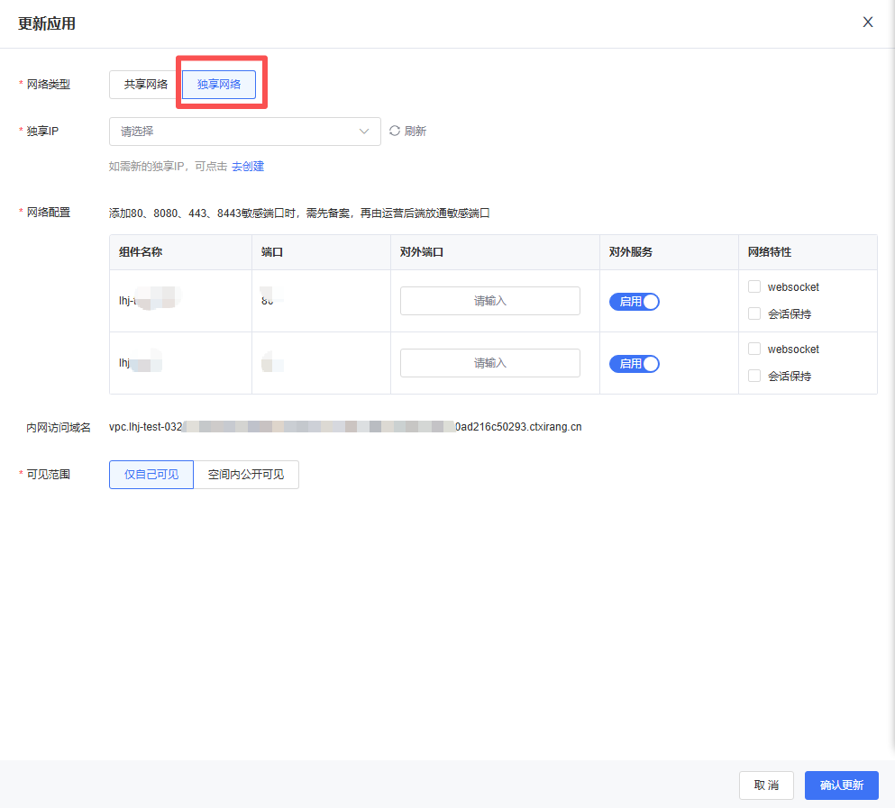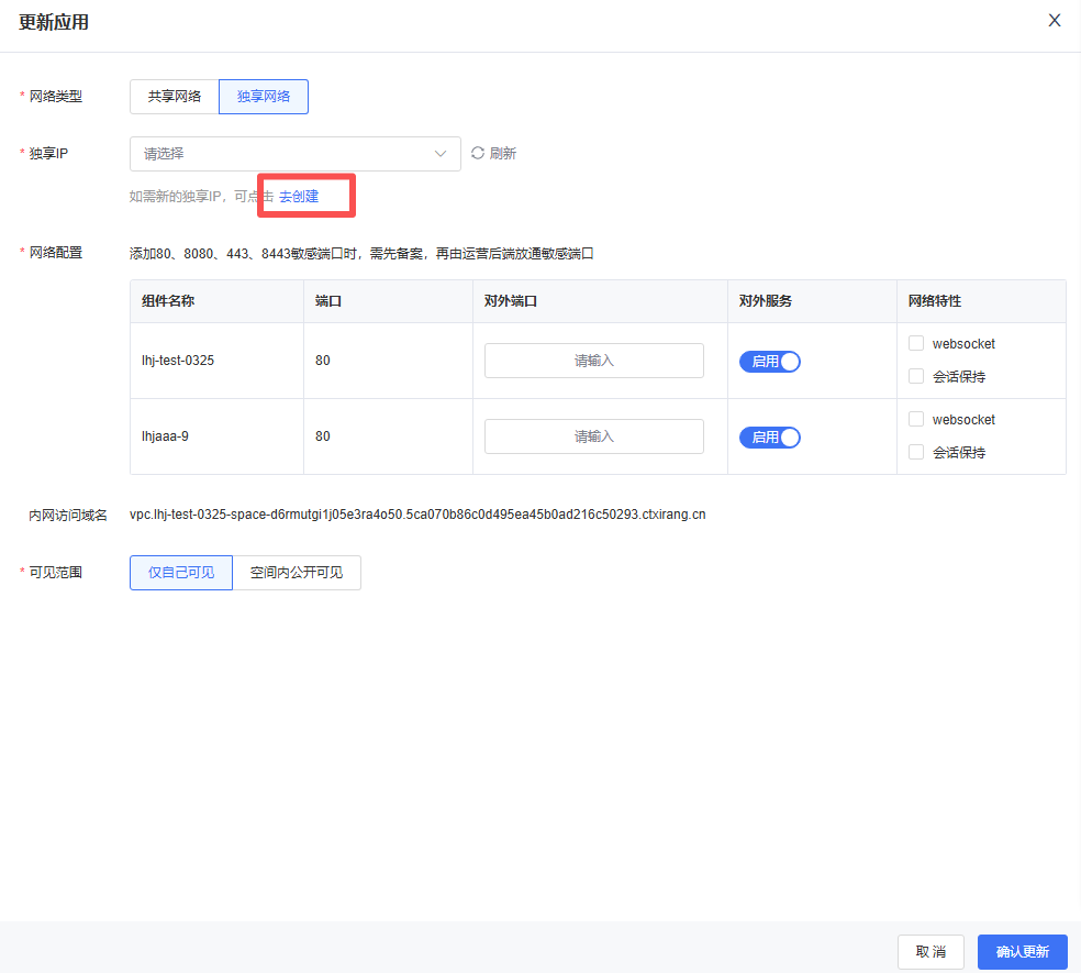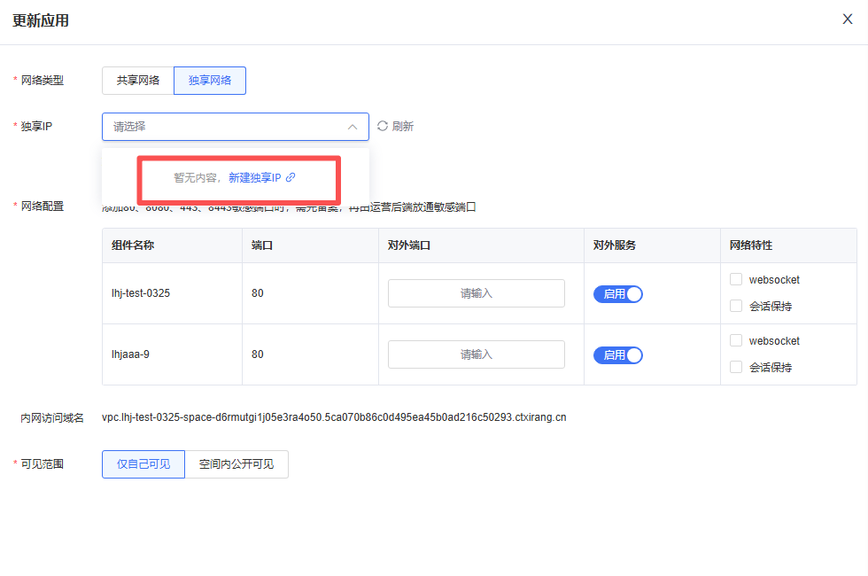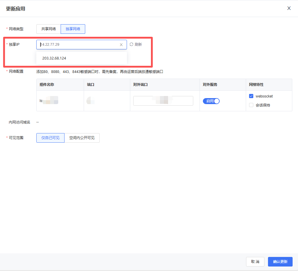 注意:更新后应用对外访问地址将替换为「独享 IP: 端口」(协议为 HTTP)。
