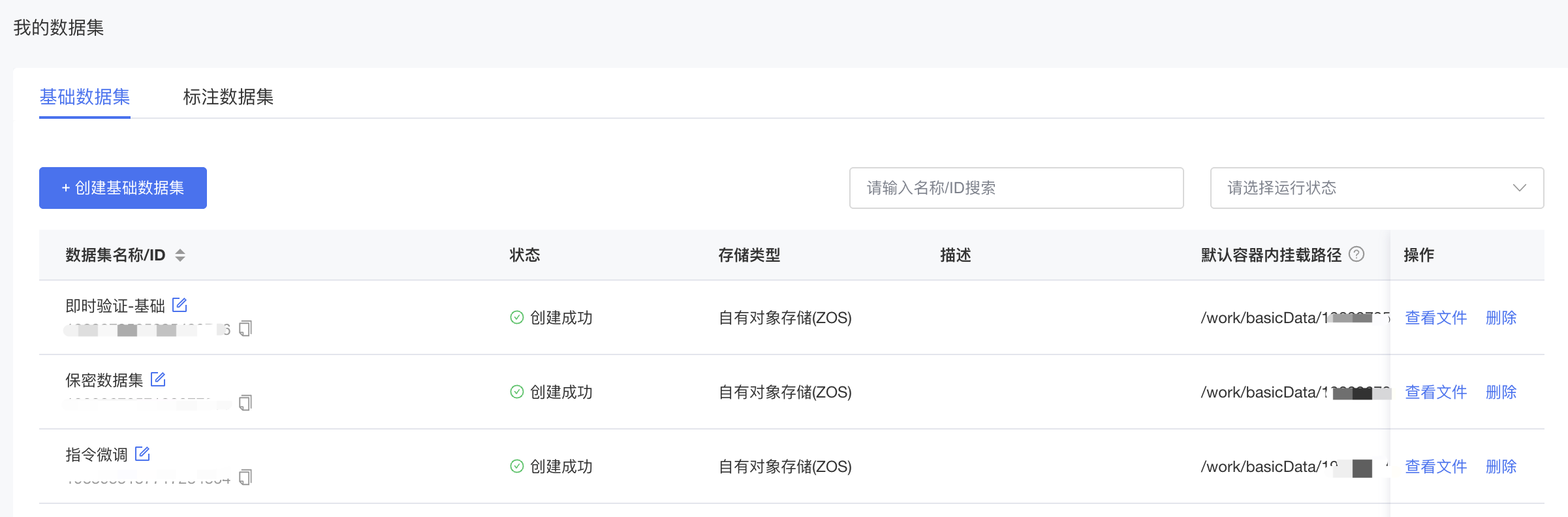 查看文件:对于共享存储,点击可查看数据集中的文件列表;对于自有存储,点击可跳转至存储控制台查看您有权限的文件。