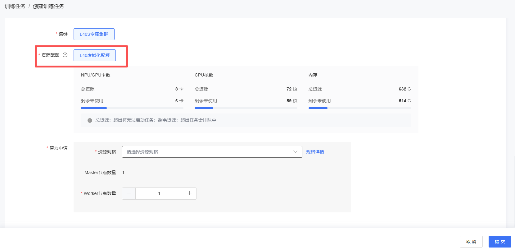 以创建训练任务为例,在创建训练任务的资源配置模块,可以选择资源配额来创建训练任务,资源配额将为训练任务提供所需资源,若当前工作空间关联了多个资源配额,在此次可以自由选择需要的资源配额。因为同一专属集群下的资源配额之间可以互相借用资源(创建配额时可以设置是否允许借用别的配额资源以及是否允许别的资源配额借用自身资源),所以,只要同一专属集群下的其他资源配额有足够资源出借,即使训练任务所需资源超出了当前资源配额的剩余资源,训练任务也是可以借用其他配额资源来进行任务训练的。