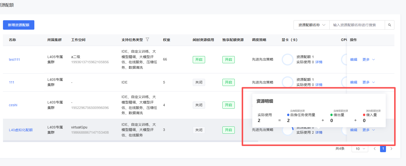 列表里的显卡、CPU、MEM(内存)三个字段:这三个字段表示资源配额的资源使用情况,以显卡字段为例: