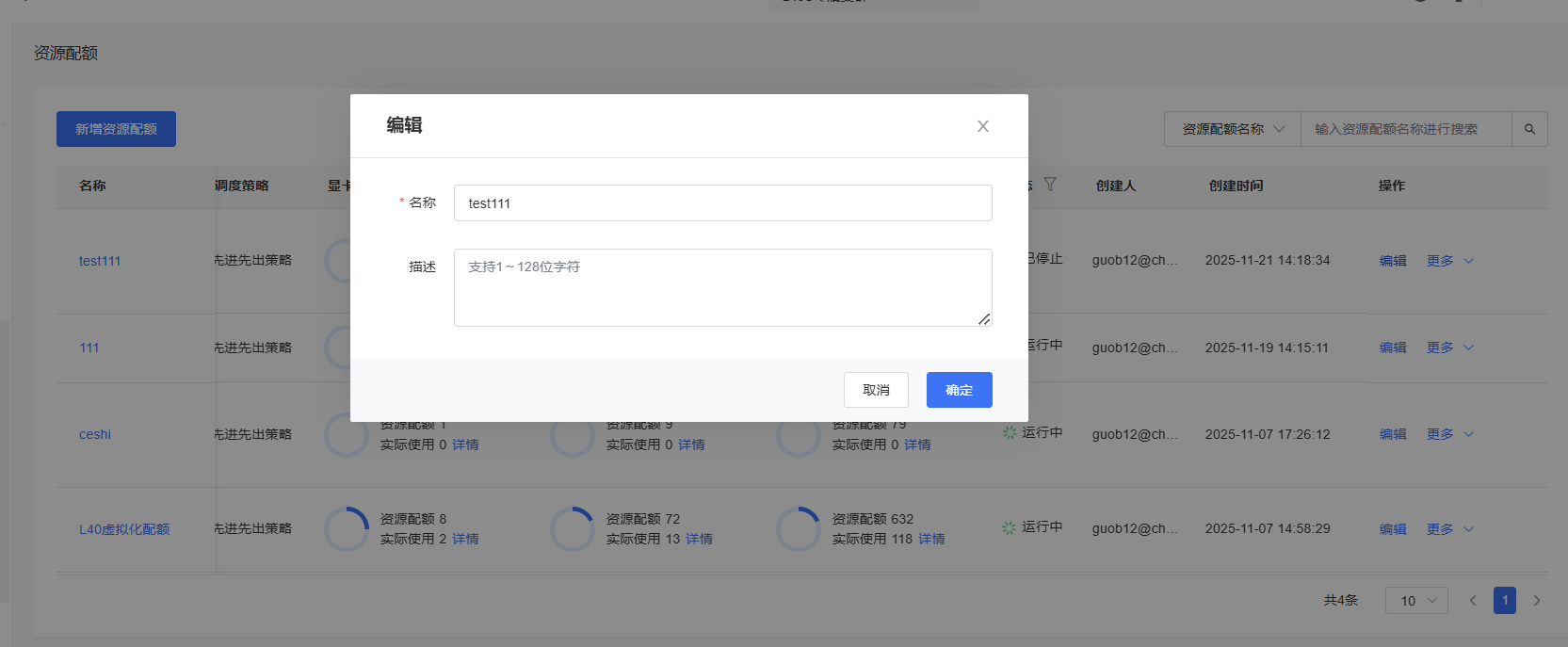 【编辑】操作:在列表右侧【操作】列,点击【编辑】按钮,会弹出资源配额编辑窗口,可修改配额名称、描述。
