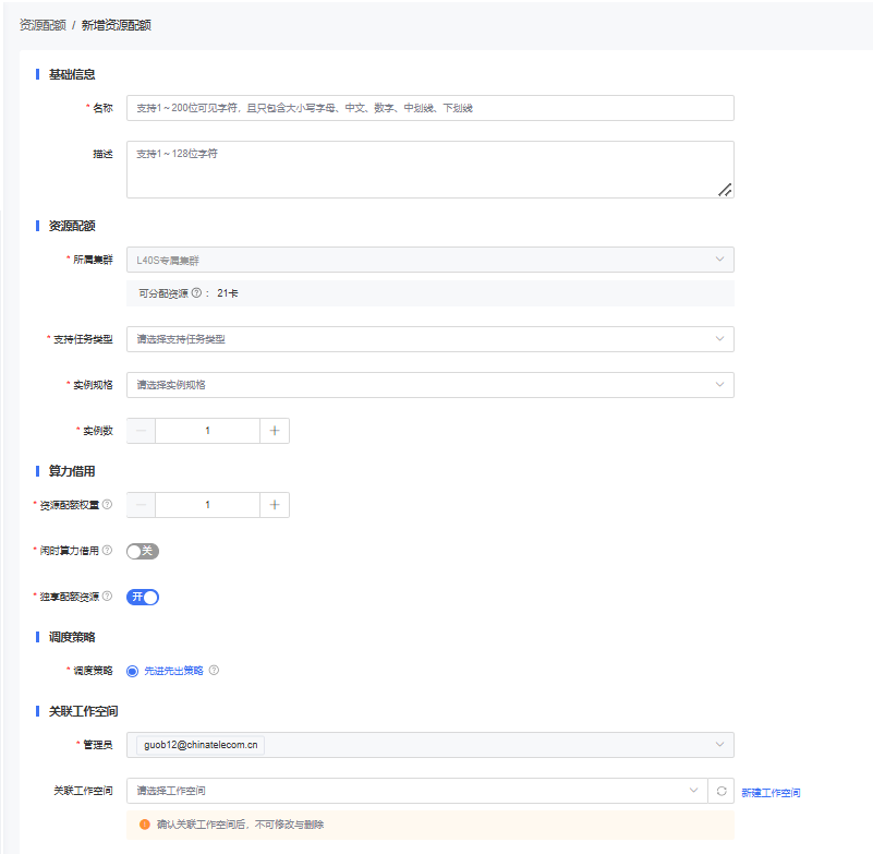 关联工作空间:将该资源配额分配给指定工作空间,在该工作空间内进行作业时,可以使用该资源配额。
