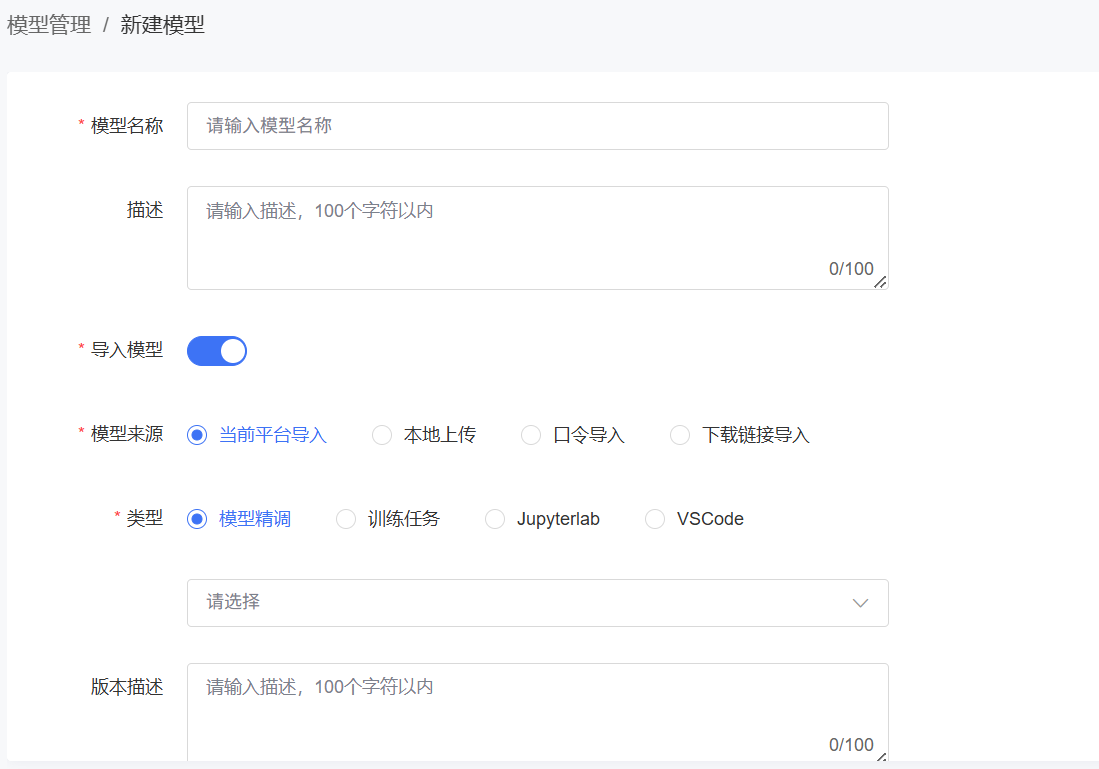 当前平台导入:支持从平台上运行完成的模型调优和训练任务中导入(分别参见模型精调和训练任务)、也可以从JupyterLab和VSCode的目录中导入(参见模型开发)。