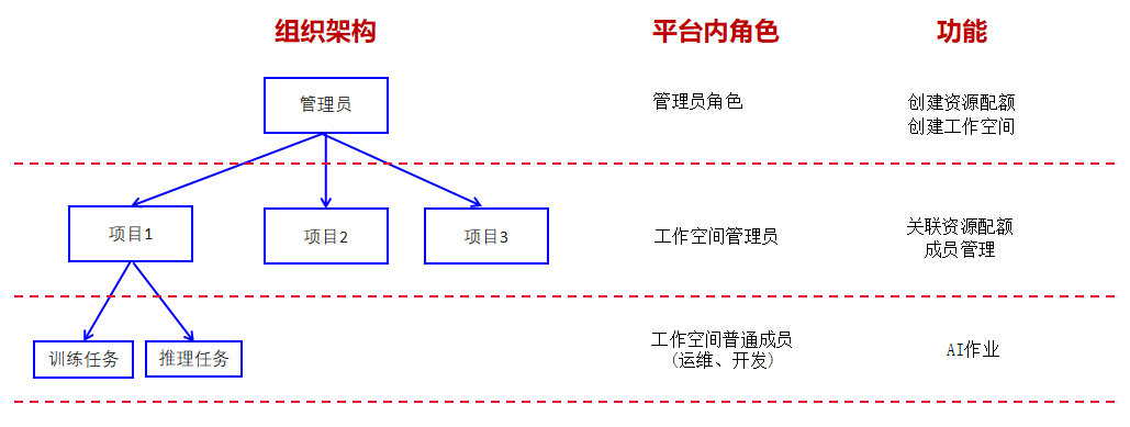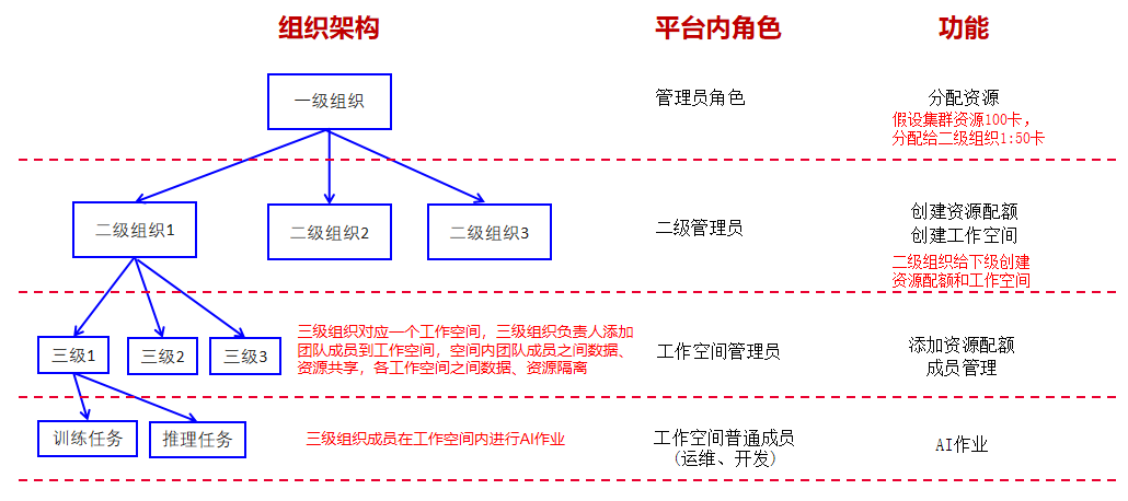 简单型多层级组织架构一般为三级,即存在一级组织总管平台,具备平台全部权限,同时二级组织所使用的资源数量需要由一级组织进行分配。二级组织下有多个项目,此时可以参照该模式进行多级资源管理,进行AI作业,组织层级及各层级角色与功能关系如下图: