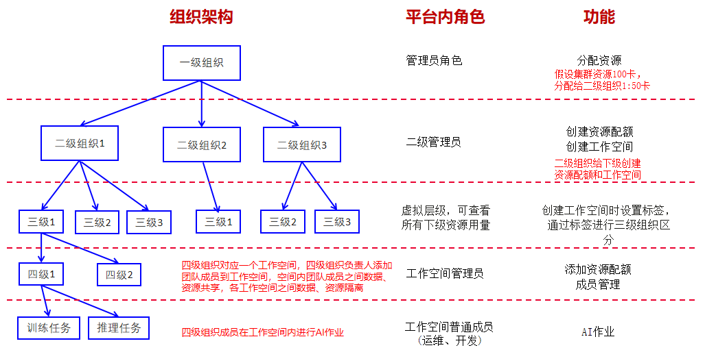 复杂型多层级组织架构一般为四级,即存在一级组织总管平台,具备平台全部权限,同时二级组织所使用的资源数量需要由一级组织进行分配。二级组织下有多个产品线,每个产品线下又有多个项目,同时需要能够查看每个产品线总体的资源用量(即下属项目总的资源使用情况),此时可以参照该模式进行多级资源管理,进行AI作业,组织层级及各层级角色与功能关系如下图: