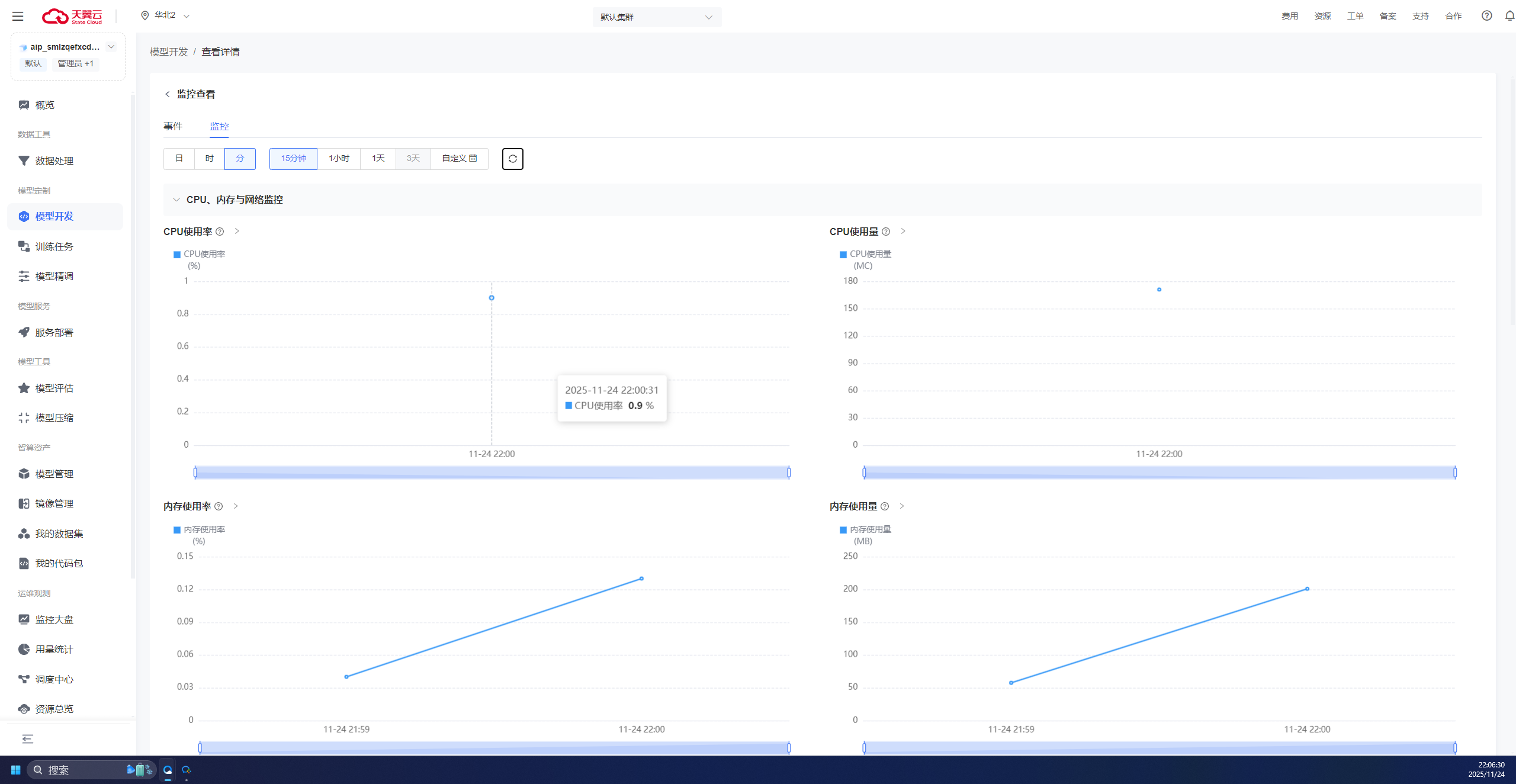 点击开发机名称,进入查看详情页面,切换到监控tab,可查看开发机的资源使用情况。目前平台的开发机都是单实例(Pod),此处监控都以实例维度展示。
