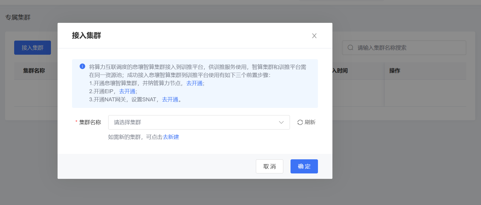 专属集群列表支持将用户在互联调度平台开通的专属集群,接入到训推平台,供训推平台使用,并提供基础的集群管理能力