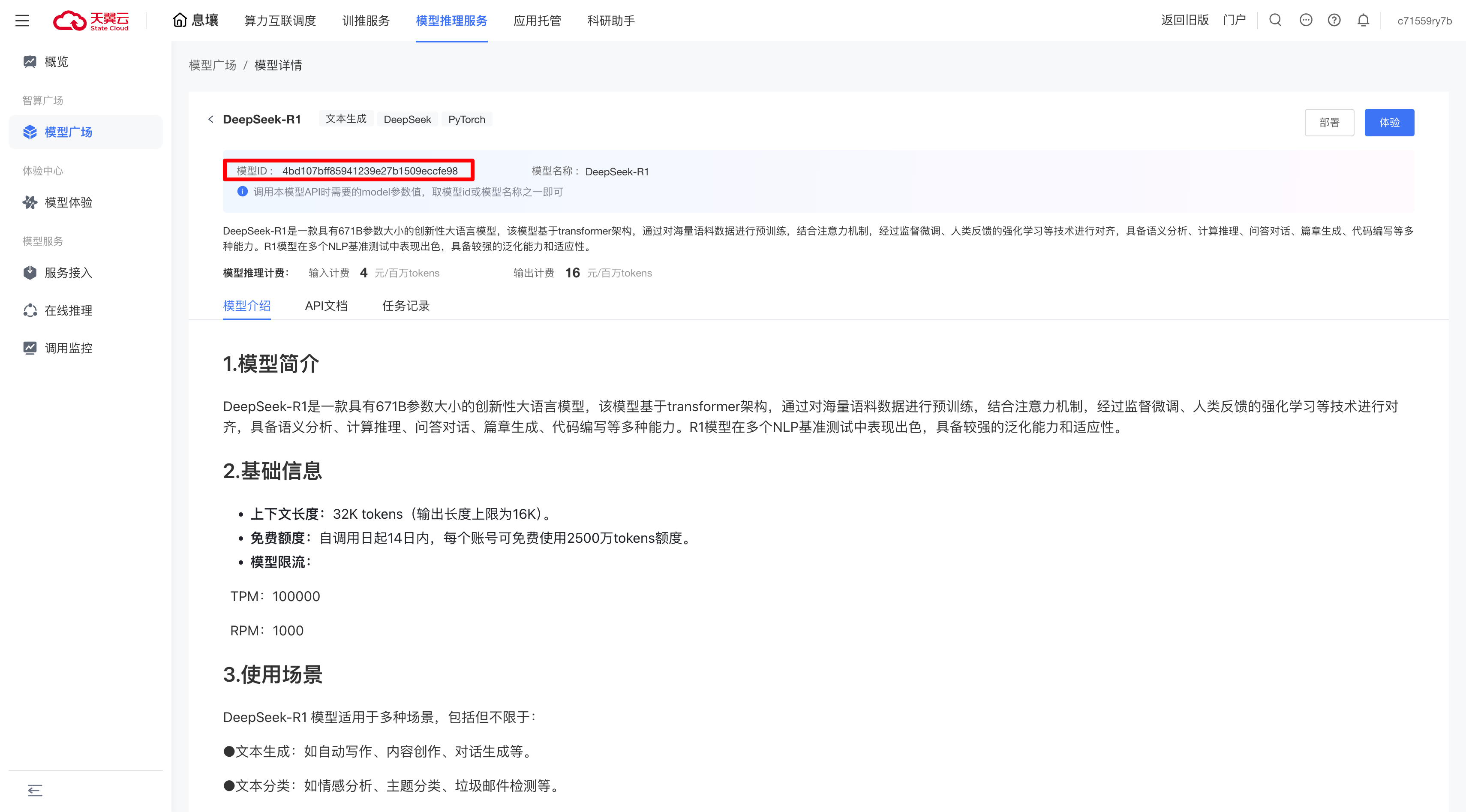 目前天翼云息壤的新老用户均可免费体验2500万Tokens,限时两周。模型广场支持DeepSeek-R1、DeepSeek-V3等多个版本模型的调用。