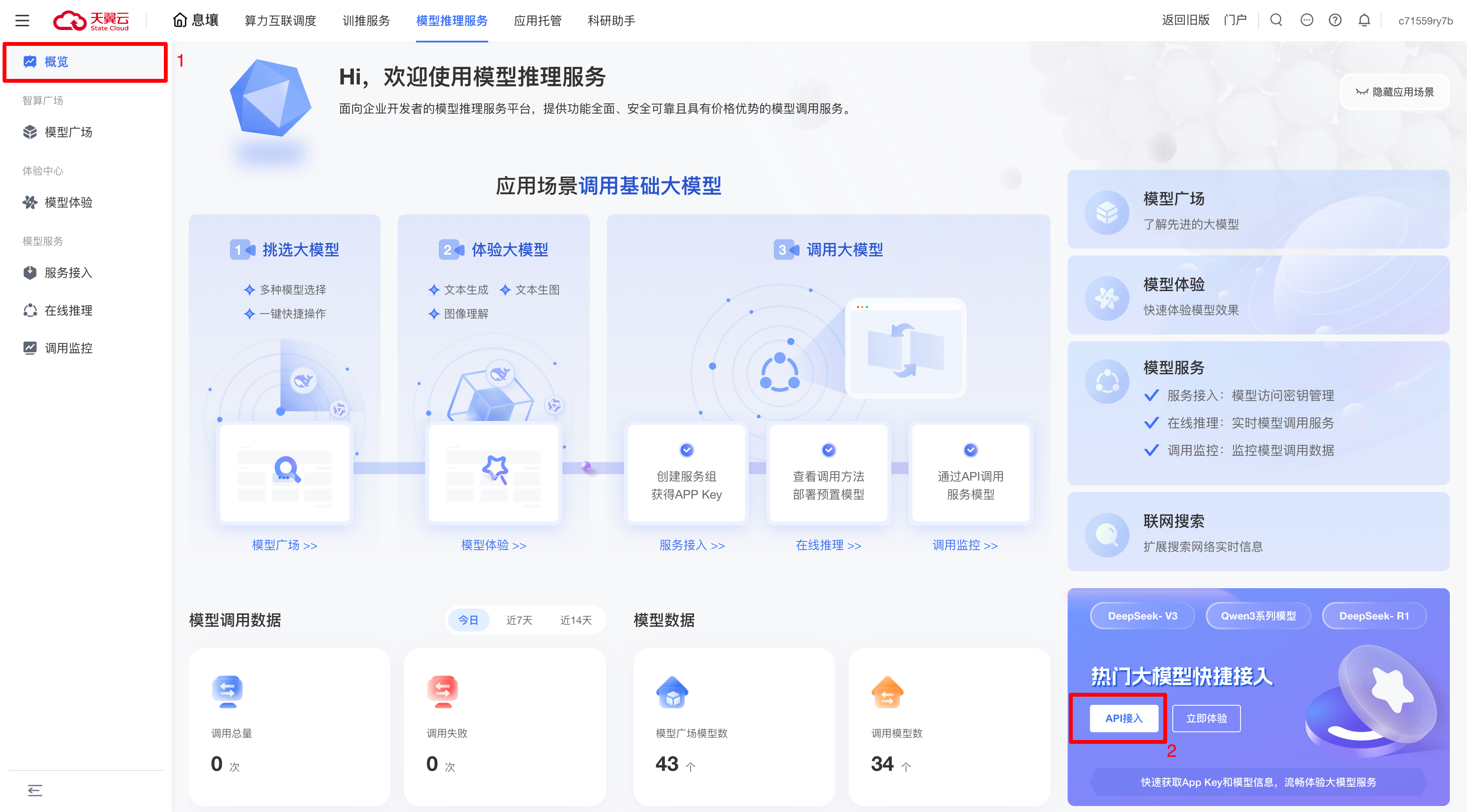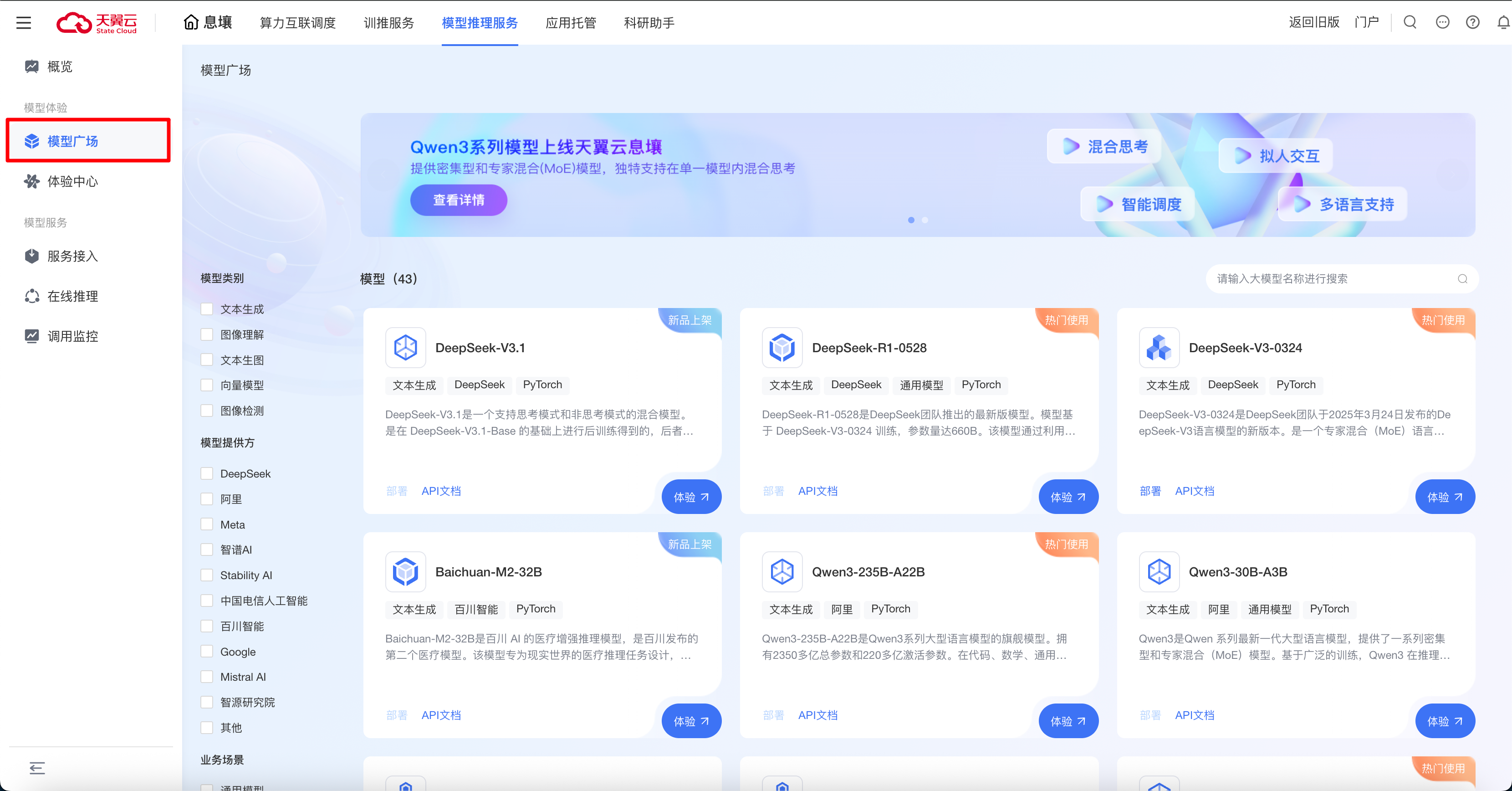 左侧导航栏切换到“模型广场”,选择对应想要调用的模型。