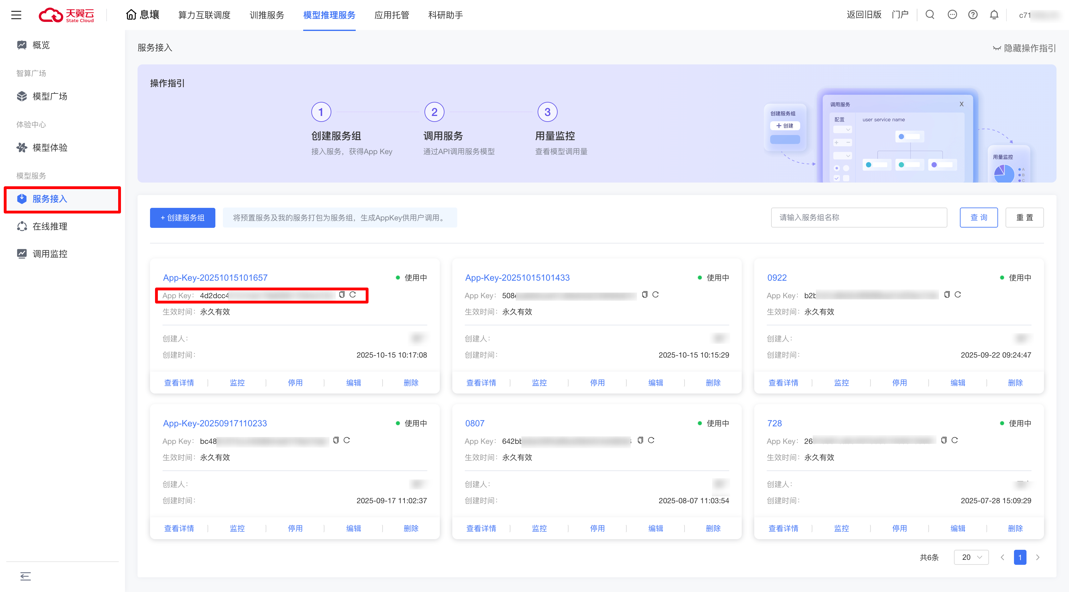 可进入左侧菜单栏的“服务接入”页,查看所创建的服务组及对应APP Key。