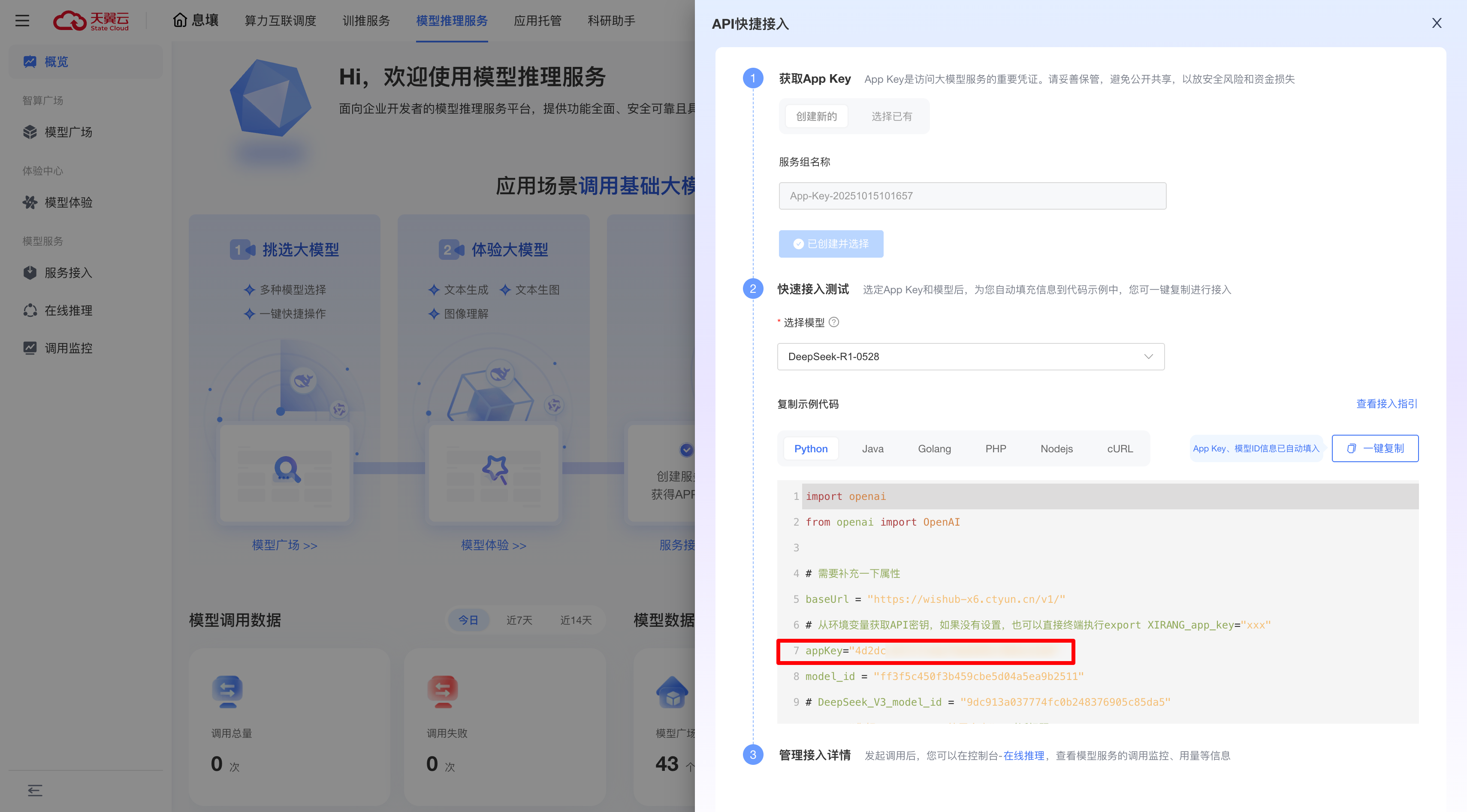 选择完成后,页面下方将自动展示该模型支持的所有编程语言的示例代码。
