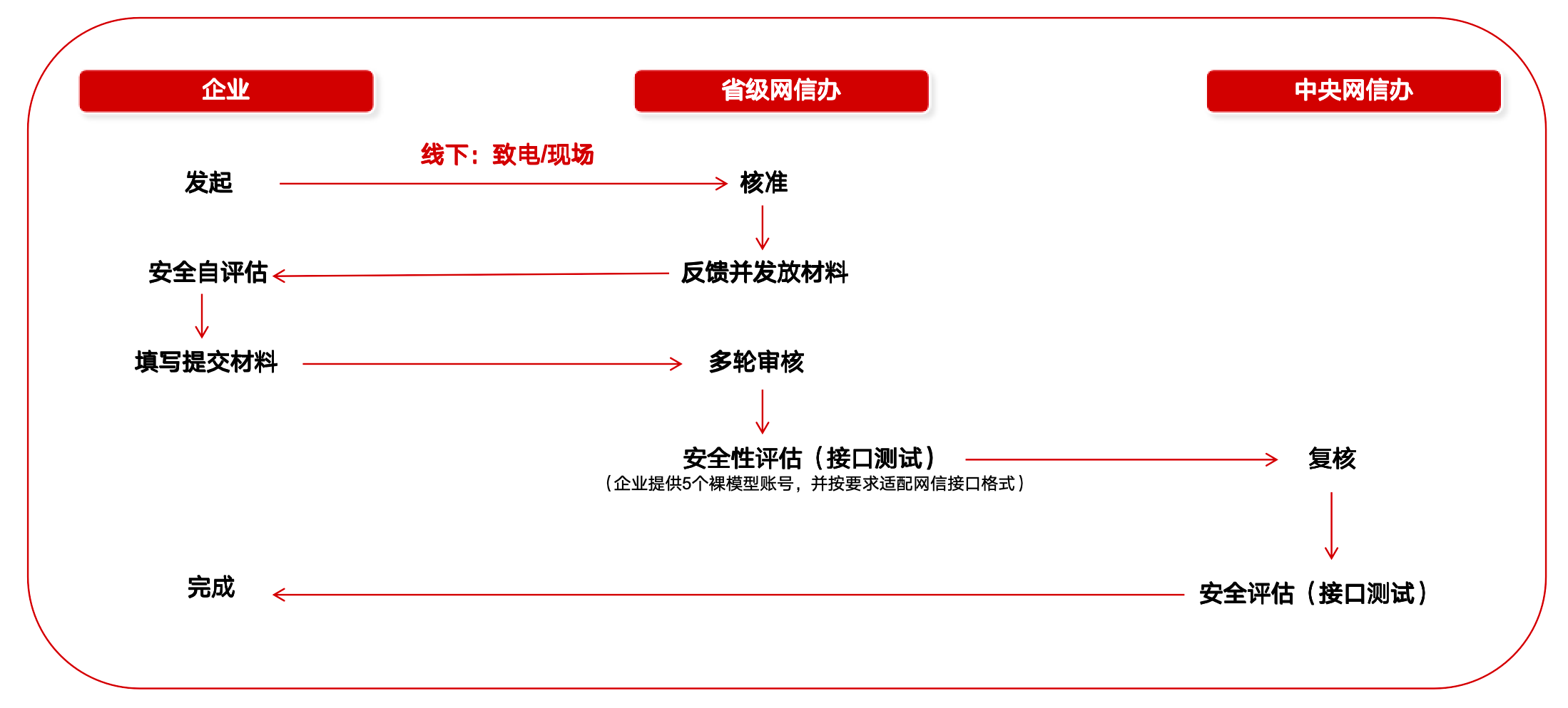 申请单位将材料附件及5个实名认证测试账号提交给属地网信办进行初审。审核过程中,属地网信办会对材料的完整性、准确性进行核查,并对大模型进行技术测试。申请单位应配合属地网信办完成多轮审核,根据审核意见修改完善材料。