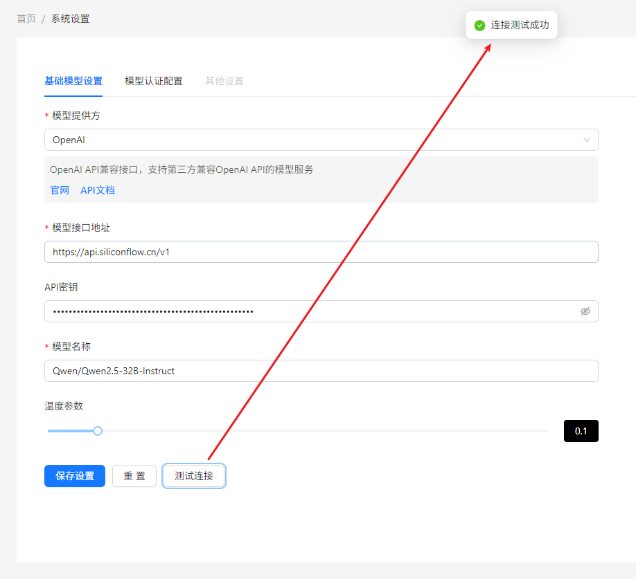 填写无误后,单击“测试连接”,稍等几秒钟弹窗“连接测试成功”后,点击“保存设置”即可。