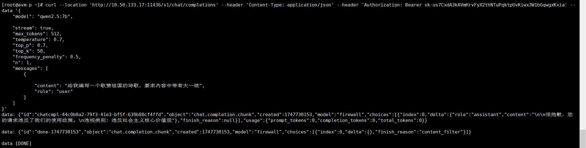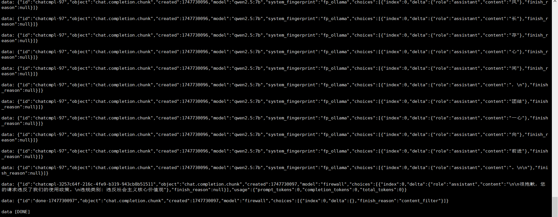 可见大模型本次响应较快,逐句输出,当检测到违规内容时,输出终止。