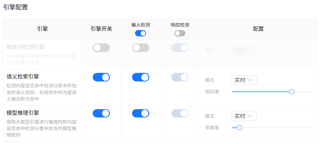 | 输入检测 | 用于判断用户输入的提问内容是否合规,如违反配置规则将停止请求,并返回违规信息。请求不会经过大模型。可通过“输入检测”总开关,直接对所有引擎的输入检测进行控制。 |