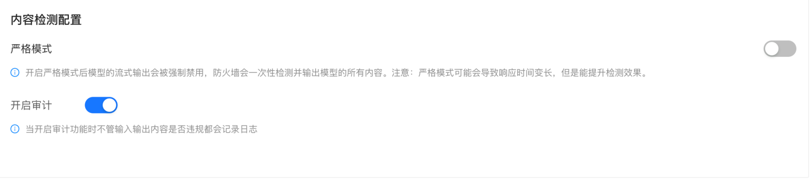 | 严格模式 | 开启后禁用流式输出,提升检测效果但可能影响响应时间和响应体验。 |