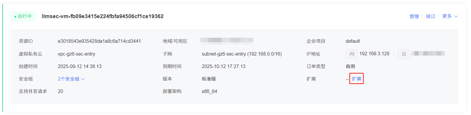 在“大模型安全卫士”实例页面,找到需要扩展性能的实例,单击“扩展”。