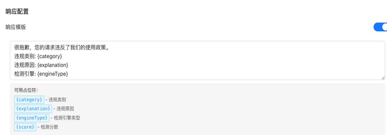 | 占位符 | 支持使用{category}、{explanation}、{engineType}、{score}等占位符 |