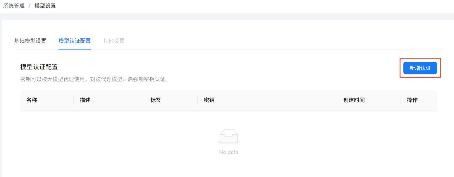 此时被代理模型必须进行认证才可访问,可进入“系统管理 > 模型设置 > 模型认证配置”页面,查看代理密钥。