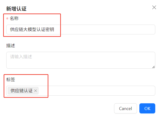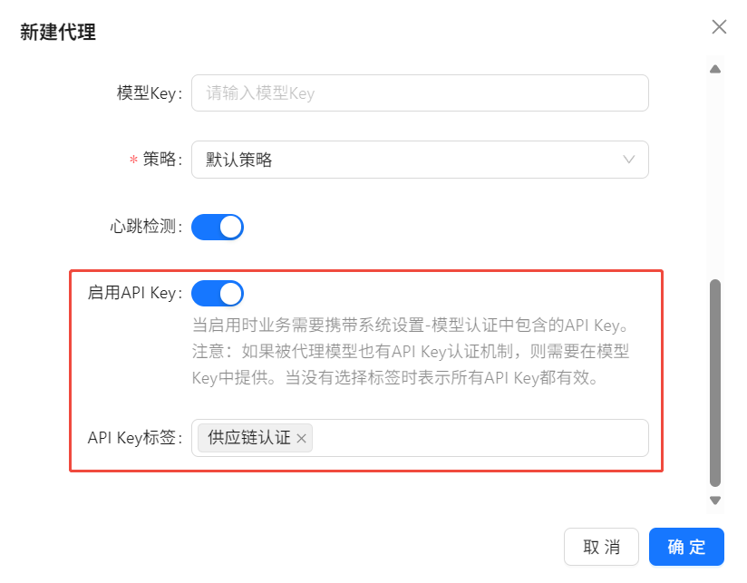 在新建代理时“启用API Key”,并在API Key标签栏输入第4步在模型认证配置中配置的标签。