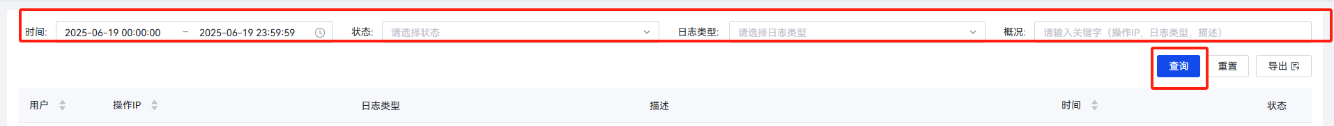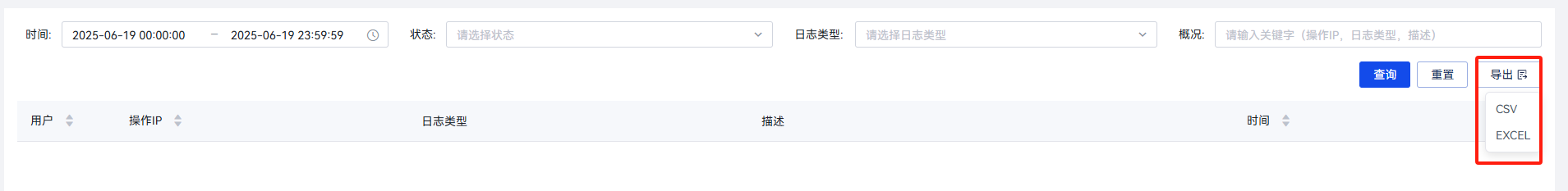 点击“导出日志”,选择文件格式(CSV 或 Excel),可将所查询的操作日志导出至本地。