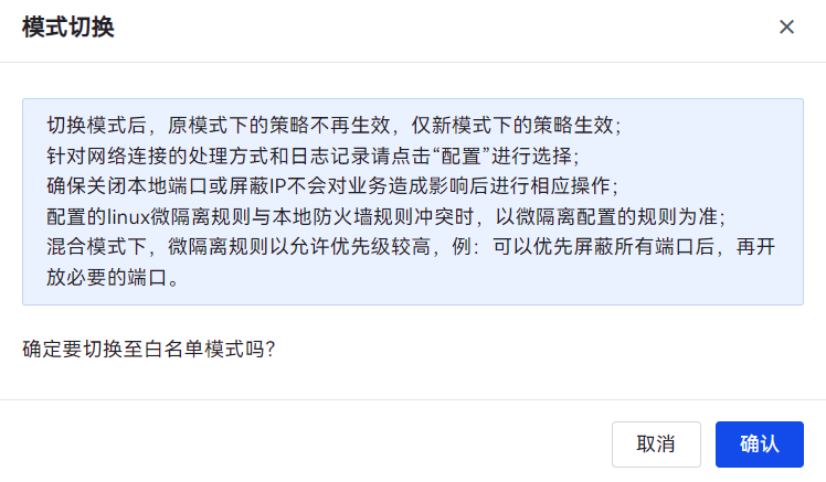 白名单模式:可以在白名单模式下配置标签规则,白名单内的规则默认放行,白名单外的规则默认阻止。