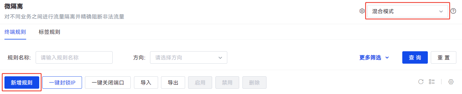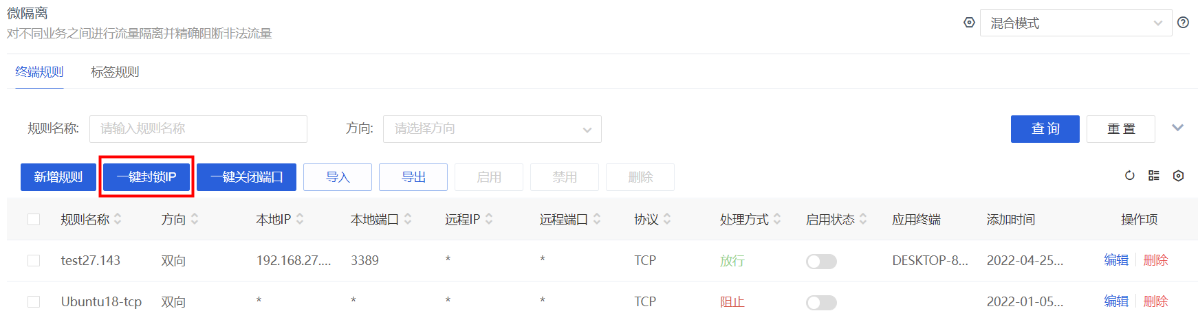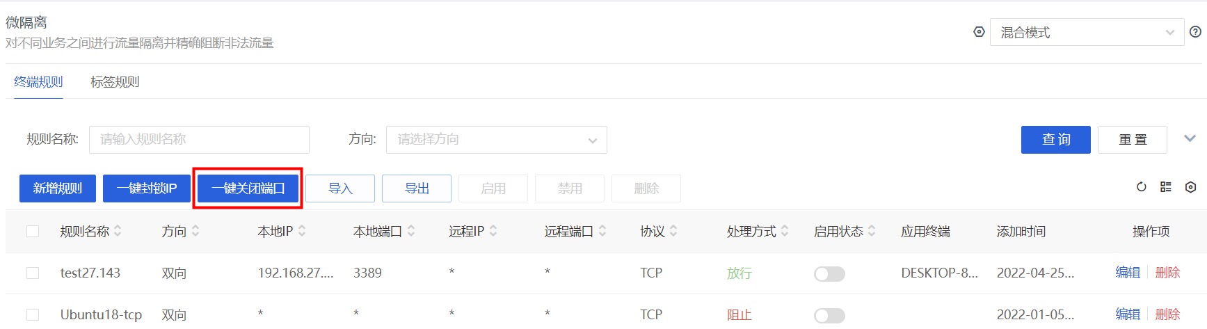 混合模式下,微隔离规则放行的优先级高于阻止,在配置时可以先阻止所有端口后,再放行必要的端口。