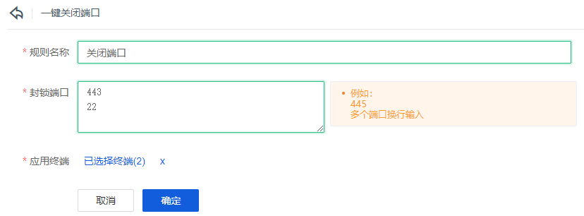 进入一键关闭端口页面,编辑相关信息,点击“确定”即可关闭该终端的端口。
