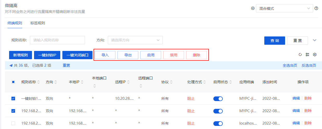 用户可启用或禁用微隔离规则,禁用后的规则不生效。