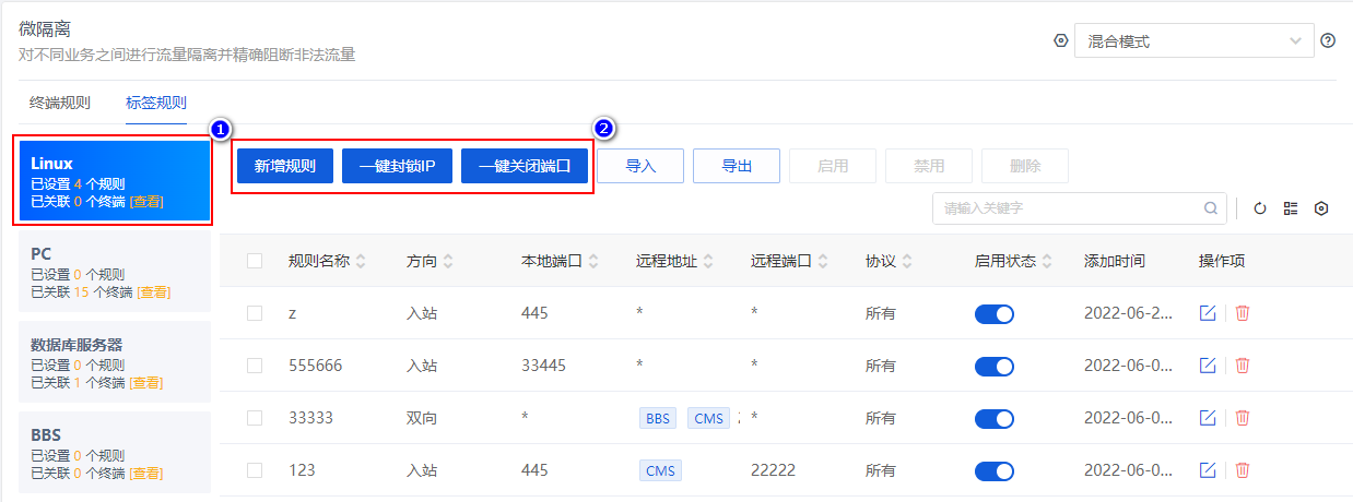 选择标签(如Linux),点击“新增规则”,可对标签下的终端新增微隔离规则。