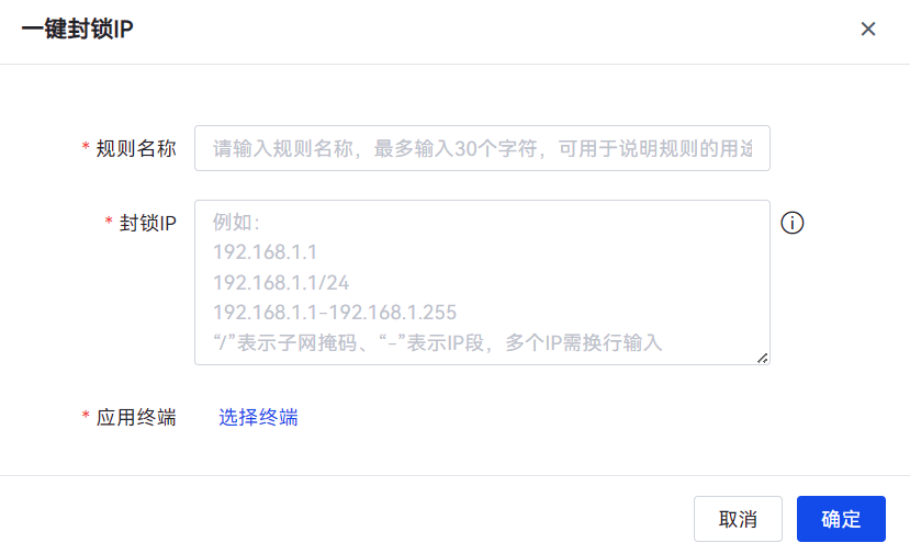 参数 说明 规则名称 长度为1~30位,支持中文、英文、数字、“_”、“-”、“.”。 封锁IP 设置终端禁止访问的IP(被封锁的IP也无法访问终端)。可设置多个,用回车分隔,例如:192.168.1.1、192.168.1.0/24、192.168.1.1-192.168.1.254。 应用终端 封锁规则应用的终端。点击“选择终端”,设置规则应用的终端。