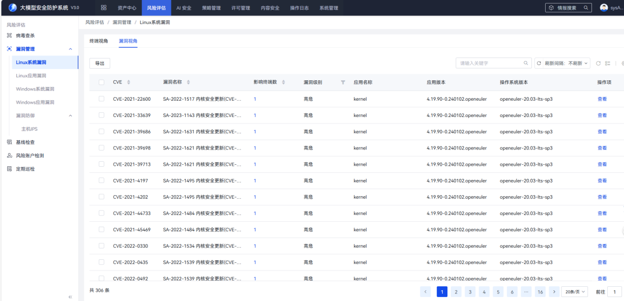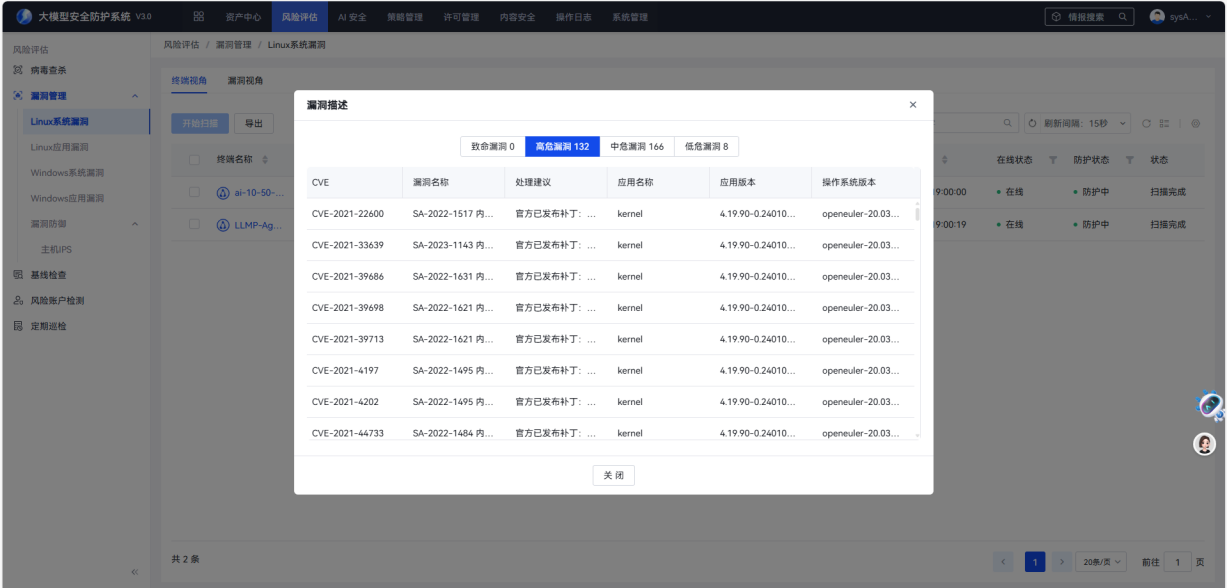 如下图所示,在“漏洞视角”页签可显示当前检测出的所有漏洞信息。