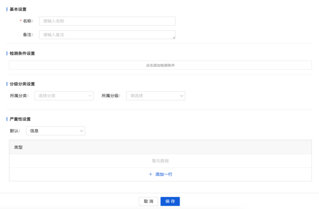 点击“新增”。填写基本设置、检测条件、分级分类、严重性等信息,点击“保存”完成检测规则配置。