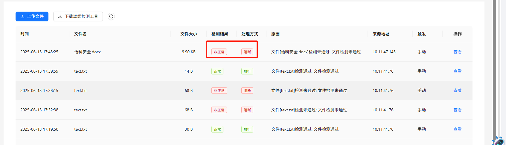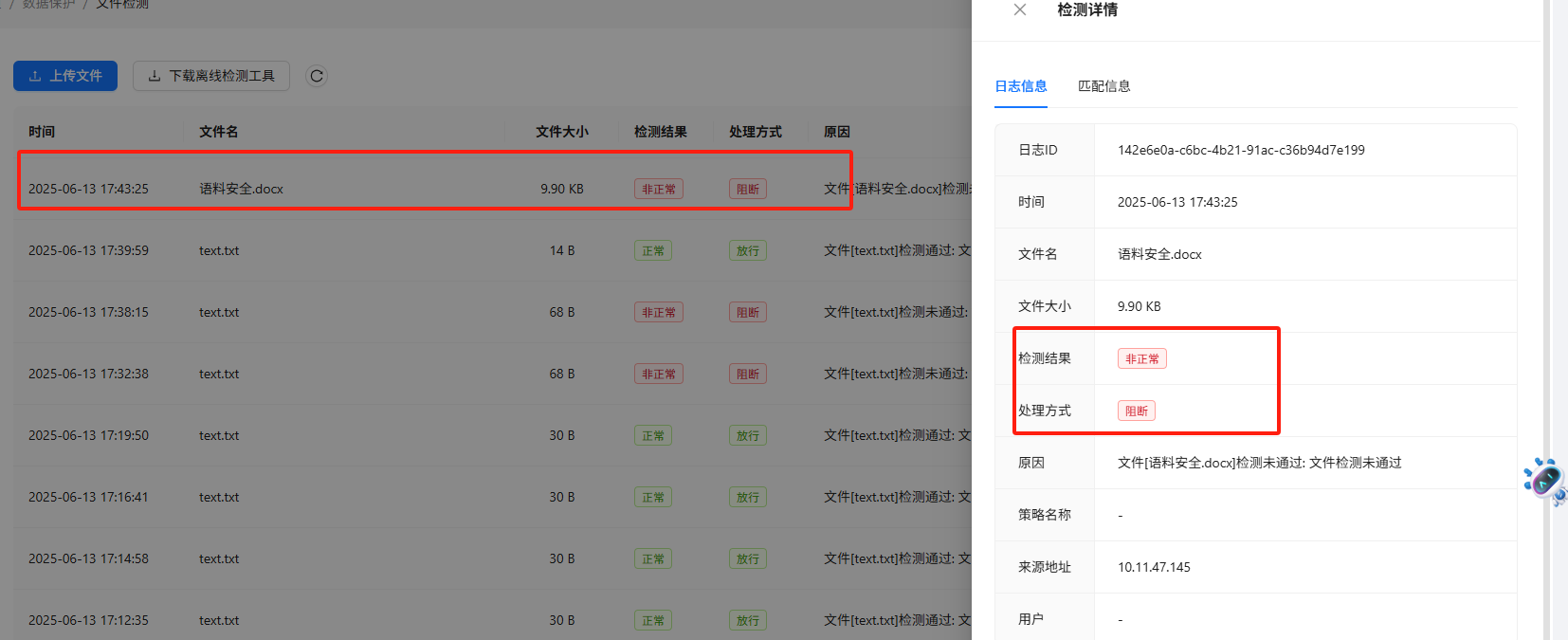 方式二:进入“内容安全 > 语料安全 > 文件检测”页面,点击“上传文件”上传包含步骤一中关键字内容的文件。