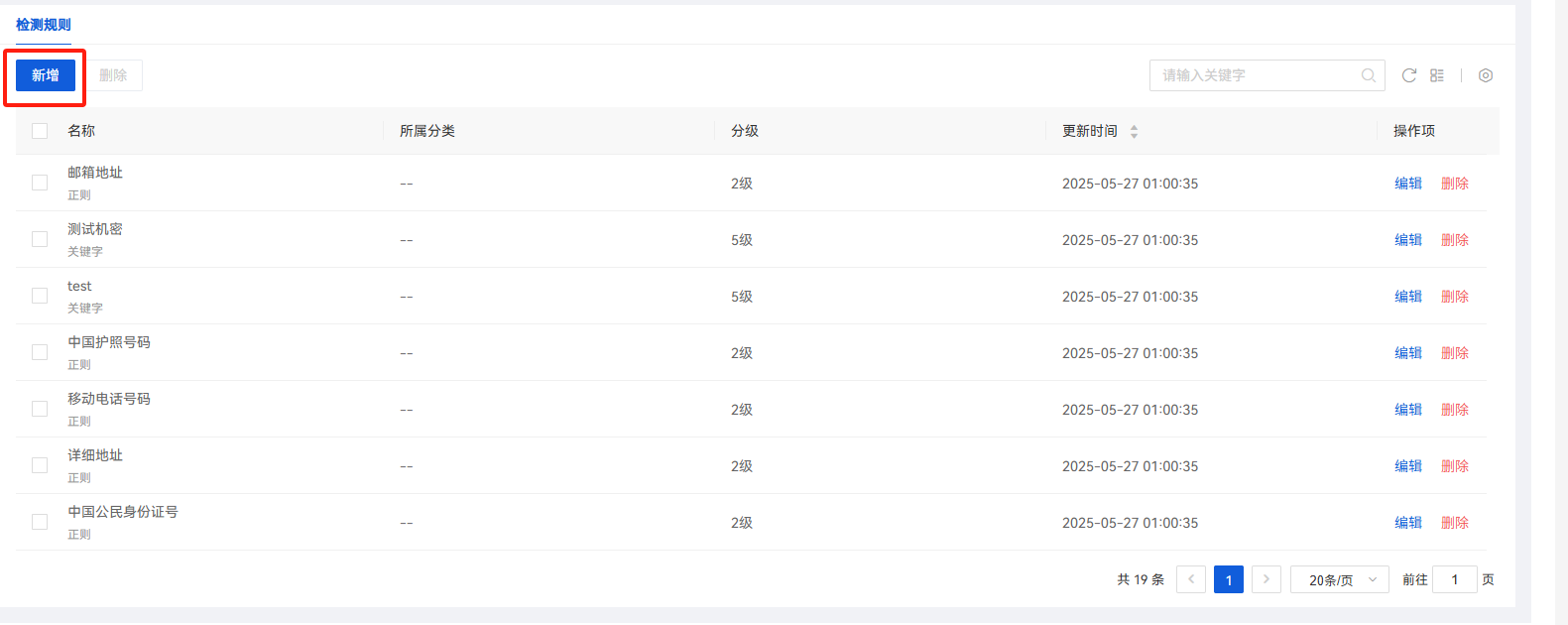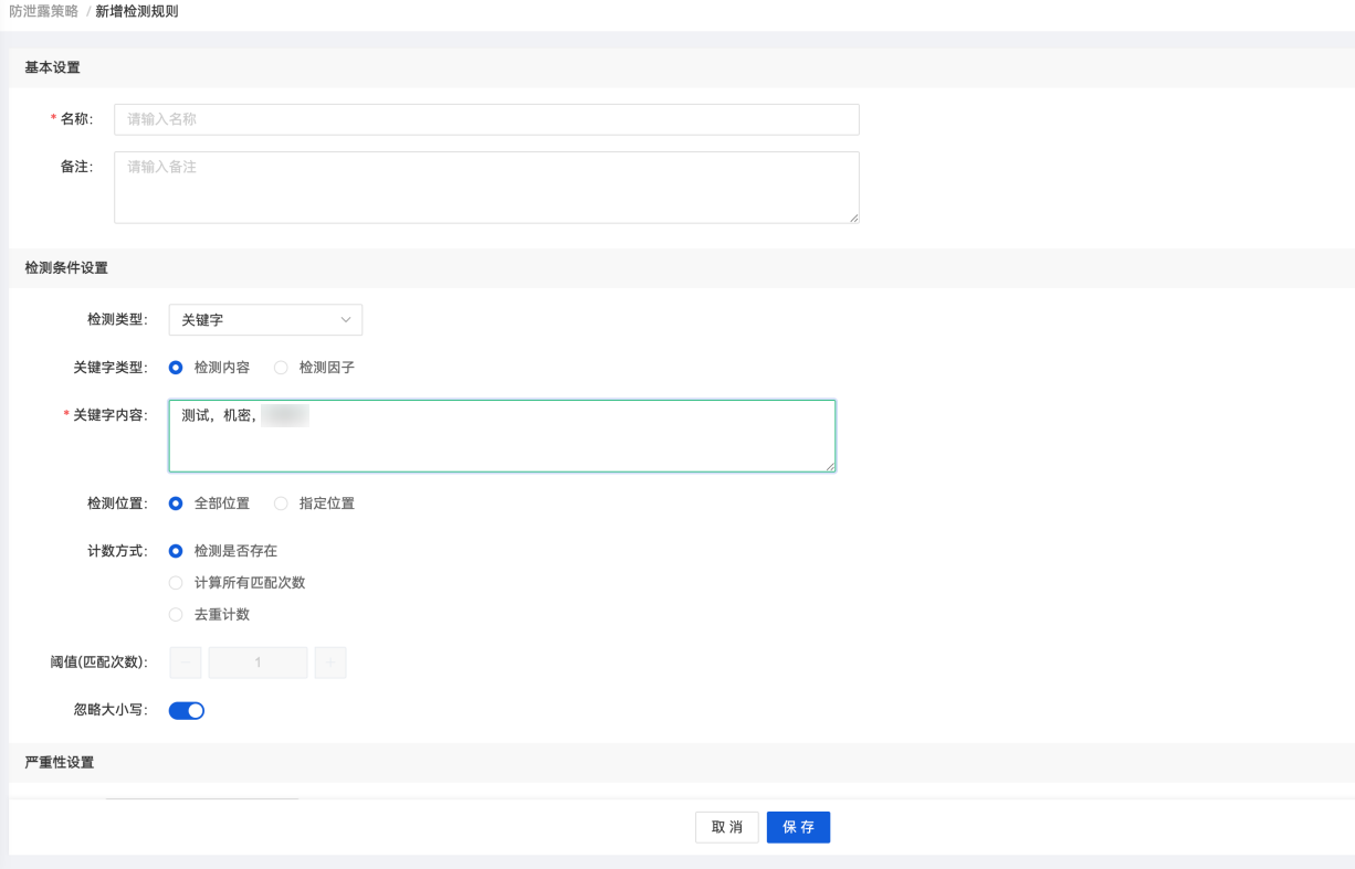 点击“新增”, 举例自定义检测内容包含关键字“机密”等。