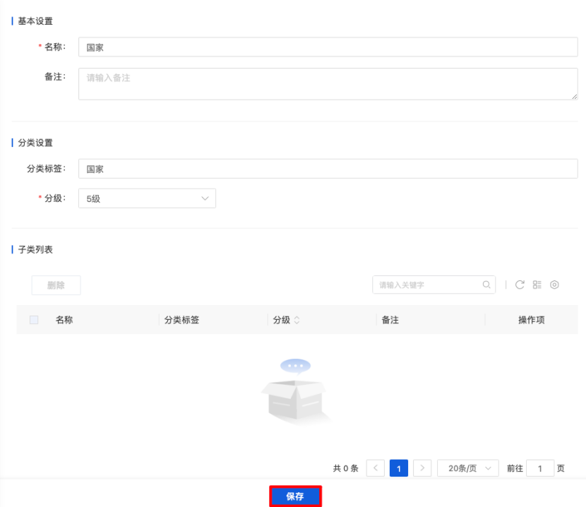 填写基本设置、分类设置、子类列表,点击“保存”。