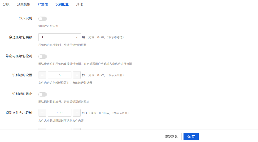 信息 说明 ocr识别 图片进行识别,对图片内的文件进行匹配。 穿透压缩包层数 压缩包内容检测时,穿透压缩包的导数,0表示不穿透,最大值为5层。(单位:秒) 识别超时设置 文件内容识别超过设置时自动发行并记录,0表示无限制。(单位:秒) 识别文件大小限制 文件大小超过限制时不识别文件内容,0表示无限制。(单位:MB) 最大匹配设置 文件内容检测时,一条检测规则最大匹配次数,0表示无限制。(单位:次) 匹配详情上传数量 日志中匹配详情最大上传数量,0表示无限制。(单位:条)