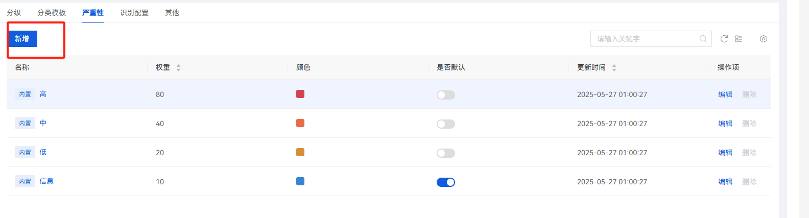 系统内置了5个严重性,用户可以通过内置严重性模板对数据进行更加便捷的分类,同时系统也支持自定义分类,可以更加灵活的满足不同场景的需求。