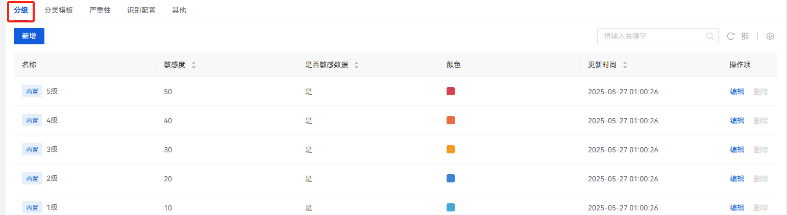 系统内置了5个分级,用户可以通过内置分级对数据进行更加便捷的分级,同时系统也支自定义分级与敏感性和敏感度的标记,可以更加灵活的满足不同场景的需求。